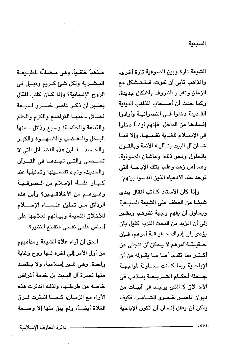 وإذا كان الأستاذ كاتب المقال يبدى شيئا من العطف على الشيعة السبعية ويحاول أن يفهم وجهة نظرهم، ويشير إلى أن المزيد من البحث النزيه كفيل بأن يؤدى إلى إدراك حقيقة أمرهم، فإن حقيقة أمرهم لا يمكن أن تنجلى عن أكثر مما تقدم. أما ما يقوله من أن الإباحية ربما كانت محاولة لمواجهة جملة أحكام الشريعة بمذهب فى الأخلاق كالذى يوجد فى أبيات من ديوان ناصر خسرو الشاعر، فكيف يمكن أن يعقل إنسان أن تكون الإباحية مذهبًا خلقيًا، وهى مضادّة للطبيعة البشرية ولكل شئ كريم ونبيل فى الروح الإنسانية؟ وإذا كان كاتب المقال يعتبر أن ذكر ناصر خسرو لسبعة فضائل -منها التواضع والكرم والحلم والقناعة والحكمة؛ وسبع رذائل- منها البخل والغضب والشهوة والكبر والحسد- فأين هذه الفضائل التى لا تحصى والتى نجدها فى القرآن والحديث، ونجد تفصيلها وتحليلها عند كبار علماء الإسلام من الصوفية وغيرهم من الأخلاقيين؟ وأين هذه الرذائل من تحليل علماء الإسلام للأخلاق الذميمة وبيانهم لعلاجها على أساس علمى نفسى منقطع النظير؟ .