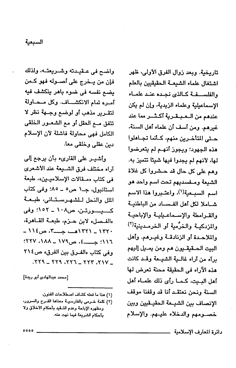 تاريخية. وبعد زوال الفرق الأولى، ظهر اشتغال علماء الشيعة الحقيقيين بالعلم والفلسفة كالذى نجده عند علماء الإسماعيلية وعلماء الزيدية، وإن لم يكن عندهم من العبقرية أكثر مما عند غيرهم. ومن أسف أن علماء أهل السنة، حتى المتأخرين منهم، كأنما تجاهلوا هذه الجهود؛ ويجوز أنهم لم يتعرضوا لها، لأنهم لم يجدوا فيها شيئا تتميز به. وهم على كل حال قد حشروا كل غلاة الشيعة ومفسديهم تحت اسم واحد هو اسم السبعية (¬1)، واعتبروا هذا الاسم شاملا لكل أهل الفساد من الباطنية والقرامطة والإسماعيلية والإباحية والمزدكية والخرَّمية أو الخرمدينية (¬2) والملاحدة أو الزنادقة وغيرهم. وأهل البيت الحقيقيون هم ومن يميل إليهم برآء من آراء غالية الشيعة وقد كانت هذه الآراء فى الحقيقة محنة تعرض لها أهل البيت، كما رأى ذلك علماء أهل السنة ونحن نعتقد أنا قد وقفنا موقف الأنصاف بين الشيعة الحقيقيين وبين خصومهم والدخلاء عليهم. والإسلام واضح فى عقيدته وشريعته، ولذلك فإن من يخرج على أصوله فهو كمن يضع نفسه فى ضوء باهر ينكشف فيه أمره تمام الانكشاف. وكل محاولة لتقرير مذهب أو لوضع وجهة نظر لا تتفق مع العقل أو مع الشعور الخلقى الكامل فهى محاولة فاشلة لأن الإسلام دين عقلى وخلق معا.