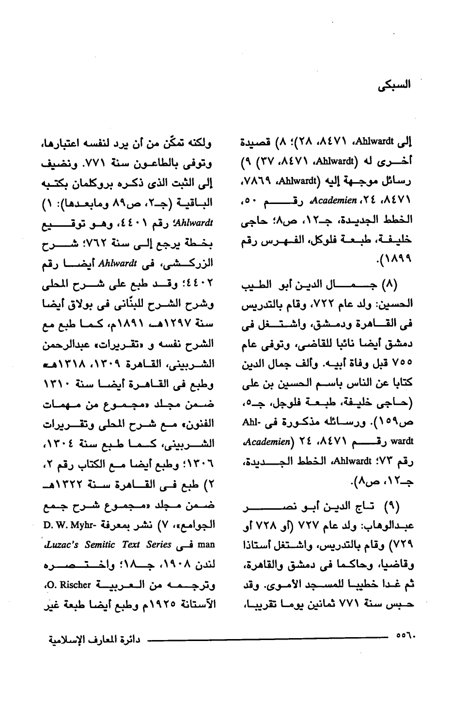 (9) تاج الدين أبو نصر عبد الوهاب: ولد عام 727 (أو 728 أو 729) وقام بالتدريس، واشتغل أستاذا وقاضيا، وحاكما فى دمشق والقاهرة، ثم غدا خطيبا للمسجد الأموى. وقد حبس سنة 771 ثمانين يوما تقريبا، ولكنه تمكّن من أن يرد لنفسه اعتبارها، وتوفى بالطاعون سنة 771. ونضيف إلى الثبت الذى ذكره بروكلمان بكتبه الباقية (جـ 2، ص 89 وما بعدها): 1) Ahlwardt؛ رقم 4401، وهو توقيع بخطة يرجع إلى سنة 762؛ شرح الزركشى، فى Ahlwardt أيضا رقم 4402؛ وقد طبع على شرح المحلى وشرح الشرح للبنّانى فى بولاق أيضًا سنة 1297 هـ، 1891 م، كما طبع مع الشرح نفسه و"تقريرات" عبد الرحمن الشربينى، القاهرة 1309، 1318 هـ. وطبع فى القاهرة أيضًا سنة 1310. ضمن مجلد "مجموع من مهمات الفنون" مع شرح المحلى وتقريرات الشربينى، كما طبع سنة 1304، 1306؛ وطبع أيضًا مع الكتاب رقم 2، 2) طبع فى القاهرة سنة 1322 هـ ضمن مجلد "مجموع شرح جمع الجوامع"، 7) نشر بمعرفة D.W.Myhrman فى Luzac's Semitic Text Series لندن 1908, جـ 18؛ واختصره وترجمه من العربية O. Rischer، الآستانة 1925 م وطبع أيضًا طبعة غير