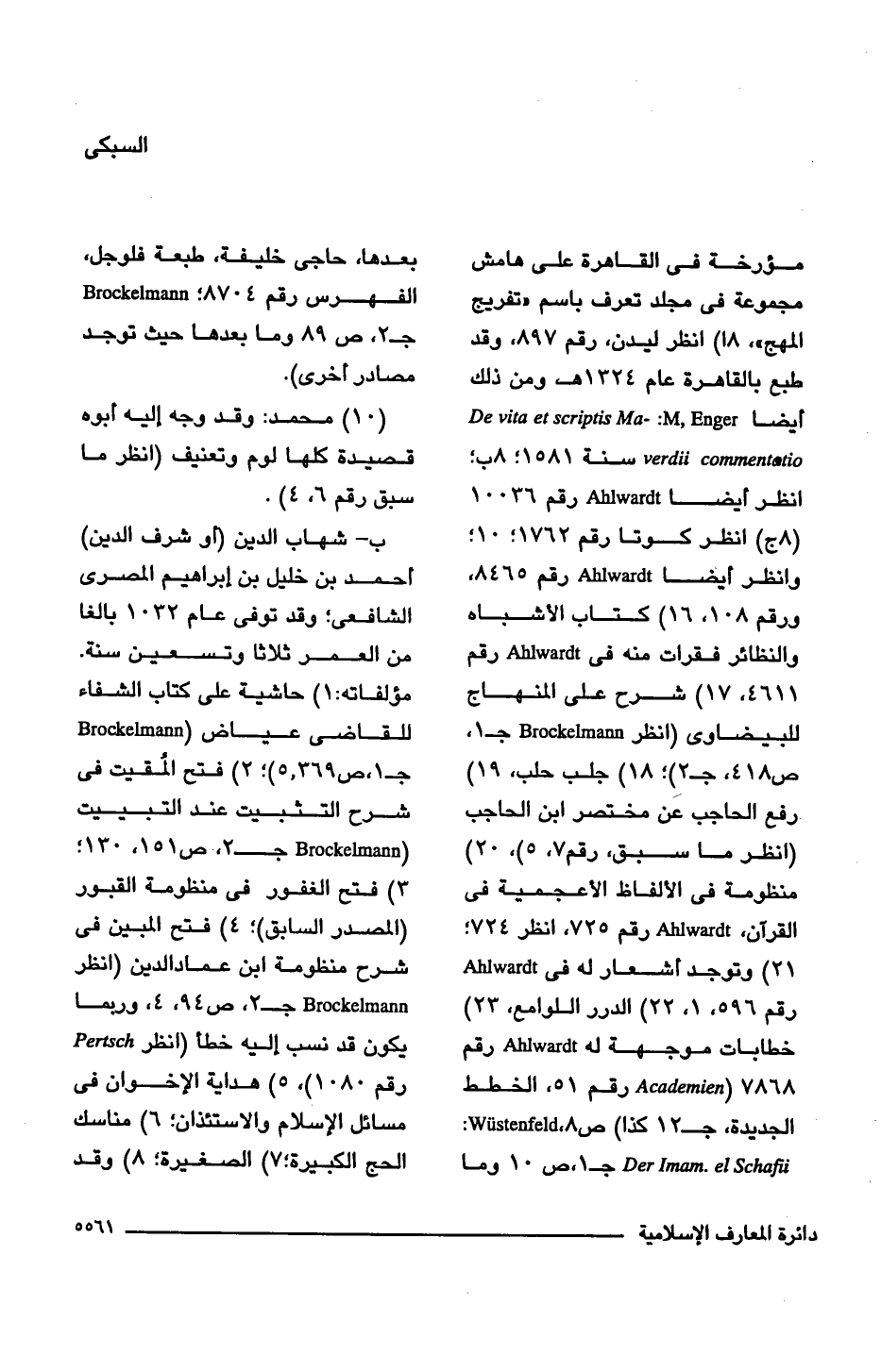 مؤرخة فى القاهرة على هامش مجموعة فى مجلد تعرف باسم "تفريج المهج"، 18) انظر ليدن، رقم 897, وقد طبع بالقاهرة عام 1324 هـ ومن ذلك أيضا De vita et scriptis Maverdii conunentstin: M, Enger سنة 1581؛ 8 ب؛ انظر أيضا Ahlwardt رقم 10036 (8 ج) انظر كوتا رقم 1762؛ 10؛ وانظر أيضا Ahlwardt رقم 8465، ورقم 108، 16) كتاب الأشباه والنظائر فقرات منه فى Ahlwardt رقم 4611، 17) شرح على المنهاج للبيضاوى (انظر Brockelmann جـ 1، ص 418، جـ 2)؛ 18 جلب حلب، 19) رفع الحاجب عن مختصر ابن الحاجب (انظر ما سبق، رقم 7، 5)، 20) منظومة فى الألفاظ الأعجمية فى القرآن، Ahlwardt , رقم 725، انظر 724؛ 21) وتوجد أشعار له فى Ahlwardt رقم 596، 1، 22) الدرر اللوامع، 23) خطابات موجهة له Ahlwardt رقم 7868 (Academien رقم 51، الخطط الجديدة، جـ 12 كذا) ص 8، Wustenfeld: Der Imam el Schafii جـ 1، ص 10 وما بعدها، حاجى خليفة، طبعة فلوجل، الفهرس رقم 8704؛ Brockelmann جـ 2، ص 89 وما بعدها حيث توجد مصادر أخرى).