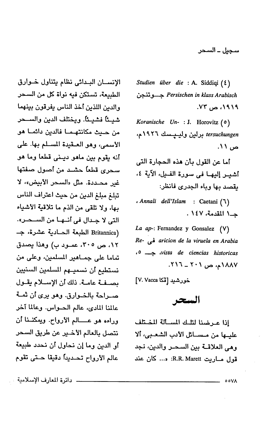 (Britannica الطبعة الحادية عشرة، جـ 12، ص 305، عمود ب) وهذا يصدق تماما على جماهير المسلمين، وعلى من نستطيع أن نسميهم المسلمين السنيين بصفة عامة. ذلك أن الإسلام يقول صراحة بالخوارق. وهو يرى أن ثمة عالمنا المادى، عالم الحواس. وعالما آخر وراءه هو عالم الأرواح. ويمكننا أن نتصل بالعالم الأخير عن طريق السحر أو الدين وما إن نحاول أن نحدد طبيعة عالم الأرواح تحديدًا دقيقا حتى تقوم