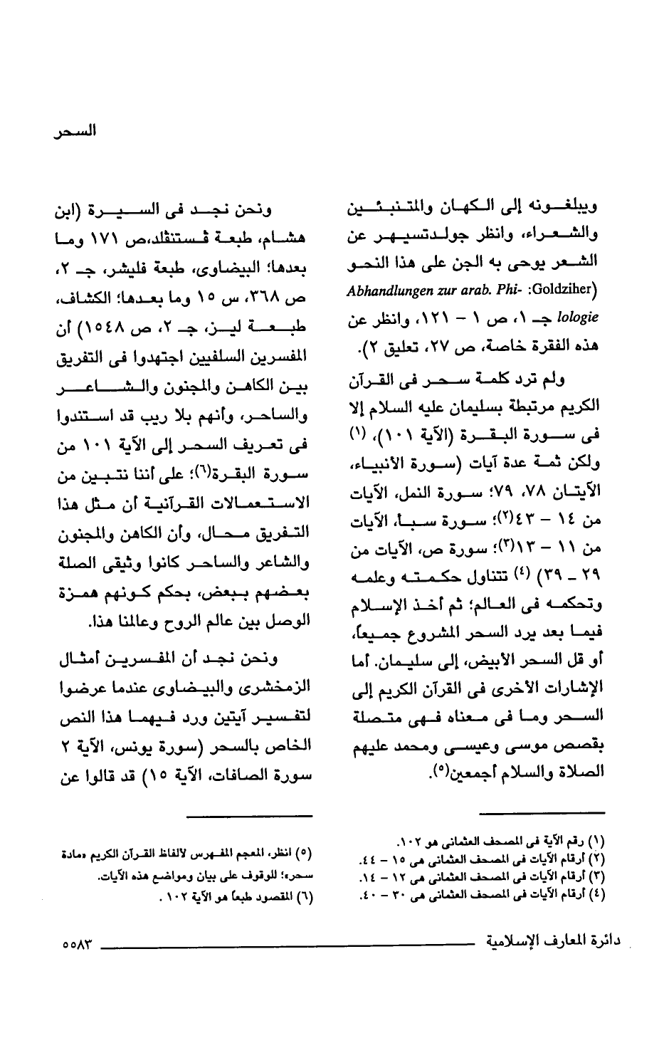ونحن نجد فى السيرة (ابن هشام، طبعة فستنفلد، ص 171 وما بعدها؛ البيضاوى، طبعة فليشر، جـ 2، ص 368، س 15 وما بعدها؛ الكشاف، طبعة ليز، جـ 2، ص 1548) أن المفسرين السلفيين اجتهدوا فى التفريق بين الكاهن والمجنون والشاعر والساحر، وأنهم بلا ريب قد استندوا فى تعريف السحر إلى الآية 101 من سورة البقرة (¬6)؛ على أننا نتبين من الاستعمالات القرآنية أن مثل هذا التفريق محال، وأن الكاهن والمجنون والشاعر والساحر كانوا وثيقى الصلة بعضهم ببعض، بحكم كونهم همزة الوصل بين عالم الروح وعالمنا هذا.