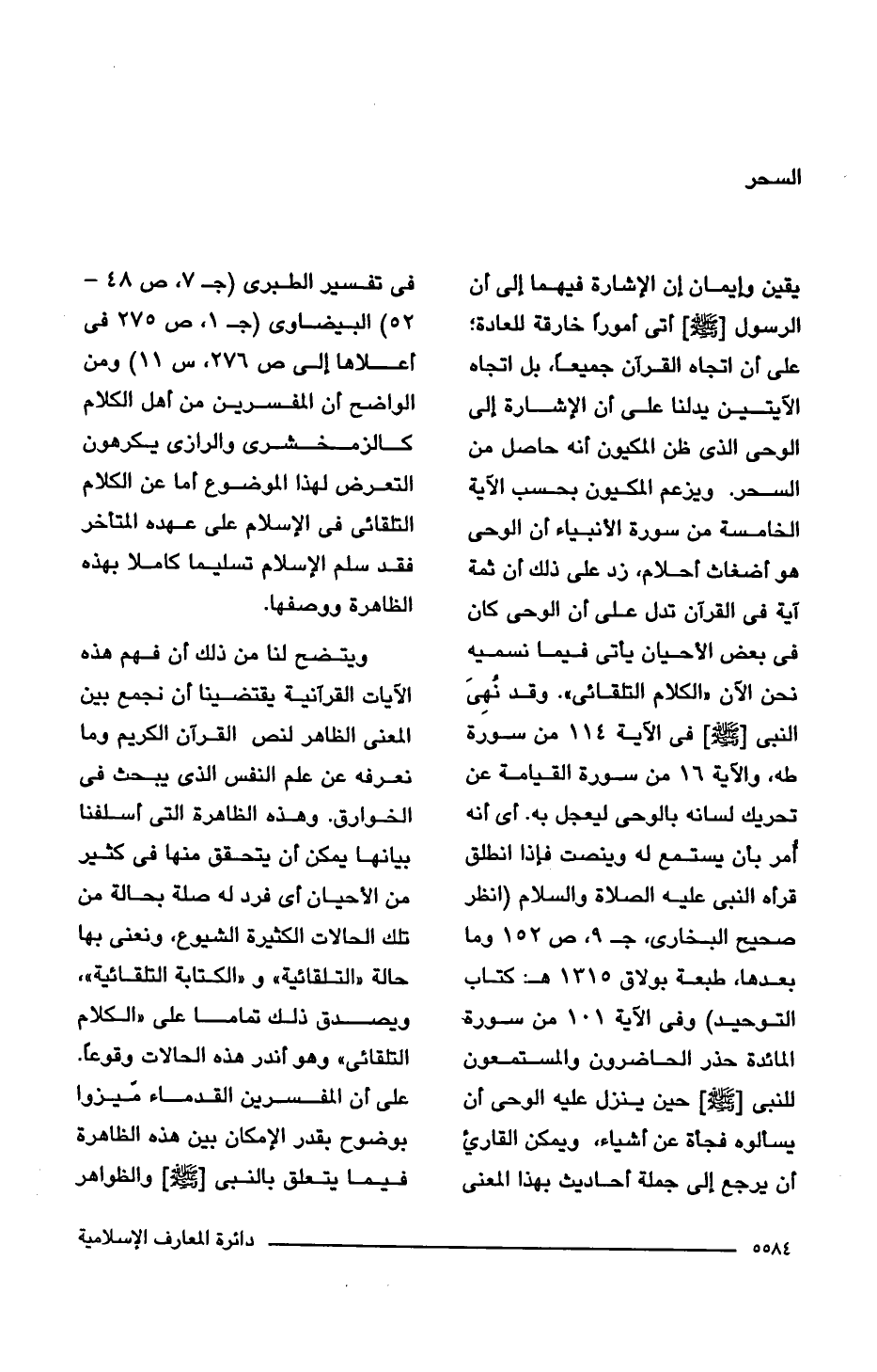 يقين وإيمان إن الإشارة فيهما إلى أن الرسول [-صلى اللَّه عليه وسلم-] أتى أمورًا خارقة للعادة؛ على أن اتجاه القرآن جميعًا، بل اتجاه الآيتين يدلنا على أن الإشارة إلى الوحى الذى ظن المكيون أنه حاصل من السحر. ويزعم المكيون بحسب الآية الخامسة من سورة الأنبياء أن الوحى هو أضغاث أحلام، زد على ذلك أن ثمة آية فى القرآن تدل على أن الوحى كان فى بعض الأحيان يأتى فيما نسميه نحن الآن "الكلام التلقائى". وقد نُهِىَ النبى [-صلى اللَّه عليه وسلم-] فى الآية 114 من سورة طه، والآية 16 من سورة القيامة عن تحريك لسانه بالوحى ليعجل به. أى أنه أُمر بأن يستمع له وينصت فإذا انطلق قرأه النبى عليه الصلاة والسلام (انظر صحيح البخارى، جـ 9، ص 152 وما بعدها، طبعة بولاق 1315 هـ: كتاب التوحيد) وفى الآية 101 من سورة المائدة حذر الحاضرون والمستمعون للنبى [-صلى اللَّه عليه وسلم-] حين ينزل عليه الوحى أن يسألوه فجأة عن أشياء، ويمكن القارئ أن يرجع إلى جملة أحاديث بهذا المعنى فى تفسير الطبرى (جـ 7، ص 48 - 52) البيضاوى (جـ 1، ص 275 فى اعلاها إلى ص 276، س 11) ومن الواضح أن المفسرين من أهل الكلام كالزمخشرى والرازى يكرهون التعرض لهذا الموضوع أما عن الكلام التلقائى فى الإسلام على عهده المتأخر فقد سلم الإسلام تسليما كاملا بهذه الظاهرة ووصفها.