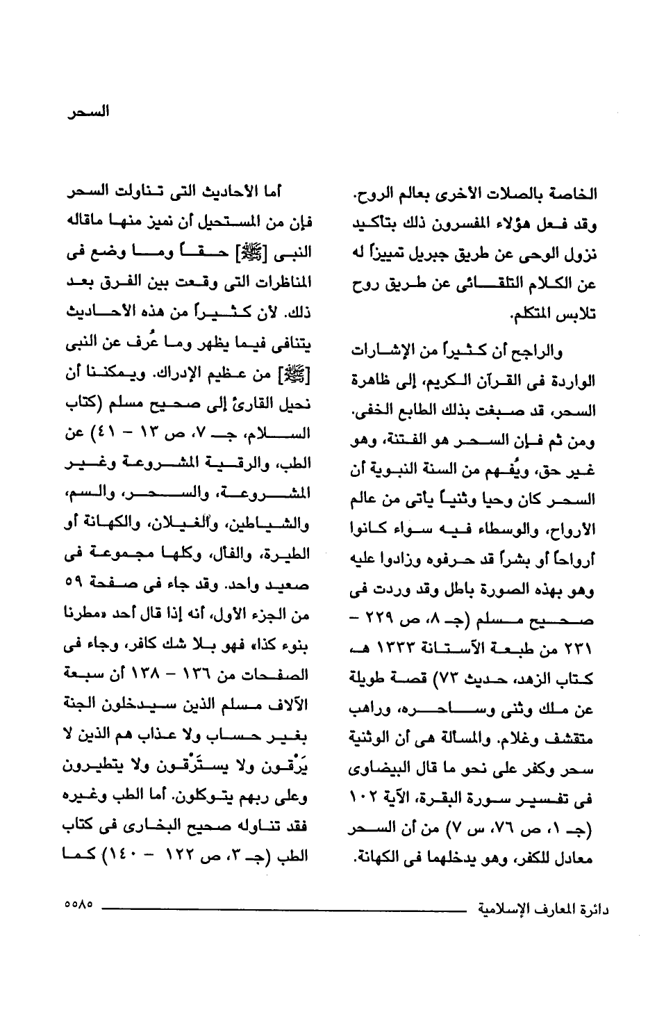 والراجح أن كثيرًا من الإشارات الواردة فى القرآن الكريم، إلى ظاهرة السحر، قد صبغت بذلك الطابع الخفى. ومن ثم فإن السحر هو الفتنة، وهو غير حق، ويُفهم من السنة النبوية أن السحر كان وحيا وثنيًا يأتى من عالم الأرواح، والوسطاء فيه سواء كانوا أرواحًا أو بشرًا قد حرفوه وزادوا عليه وهو بهذه الصورة باطل وقد وردت فى صحيح مسلم (جـ 8، ص 229 - 231 من طبعة الآستانة 1333 هـ، كتاب الزهد، حديث 73) قصة طويلة عن ملك وثنى وساحره، وراهب متقشف وغلام. والمسألة هى أن الوثنية سحر وكفر على نحو ما قال البيضاوى فى تفسير سورة البقرة، الآية 102 (جـ 1، ص 76، س 7) من أن السحر معادل للكفر، وهو يدخلهما فى الكهانة.