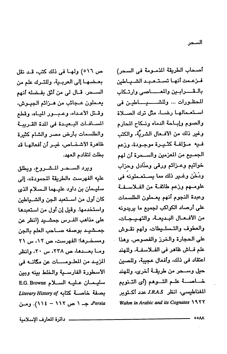 أصحاب الطريقة المذمومة فى السحر) فزعمت أنها تستعبد الشياطين بالقرابين والمعاصى وارتكاب المحظورات. . . وللشياطين فى استعمالها رضا، مثل ترك الصلاة والصوم وإباحة الدماء ونكاح المحارم وغير ذلك من الأفعال الشريِّة، والكتب فيه مؤلفة كثيرة موجودة، وزعم الجميع من المعزمين والسحرة أن لهم خواتيم وعزائم ورقى ومنَادل وحِزاب ودَخَن وغير ذلك مما يستعملونه فى علومهم وزعم طائفة من الفلاسفة وعبدة النجوم أنهم يعملون الطلسمات على أرصاد الكواكب لجميع ما يريدونه من الأفعال البديعة، والتهيجات، والعطوف والتسليطات، ولهم نقوش على الحجارة والخرز والفصوص. وهذا. علم فاش ظاهر فى الفلاسفة، وللهند اعتقاد فى ذلك، وأفعال عجيبة، وللصين حيل وسحر من طريقة أخرى، وللهند خاصة علم التوهم (أى التنويم المغناطيسى، انظر J.R.A.S عدد أكتوبر 1922 Wahm in Arabic and its Cognates ص 516) ولها فى ذلك كتب، قد نقل بعضها إلى العربية، وللترك علم من السحر. قال لى من أثق بفضله أنهم يعملون عجائب من هزائم الجيوش، وقتل الأعداء، وعبور المياه، وقطع المسافات البعيدة فى المدة القريبة والطلسمات بأرض مصر والشام كثيرة ظاهرة الأشخاص، غير أن أفعالها قد بطلت لتقادم العهد.