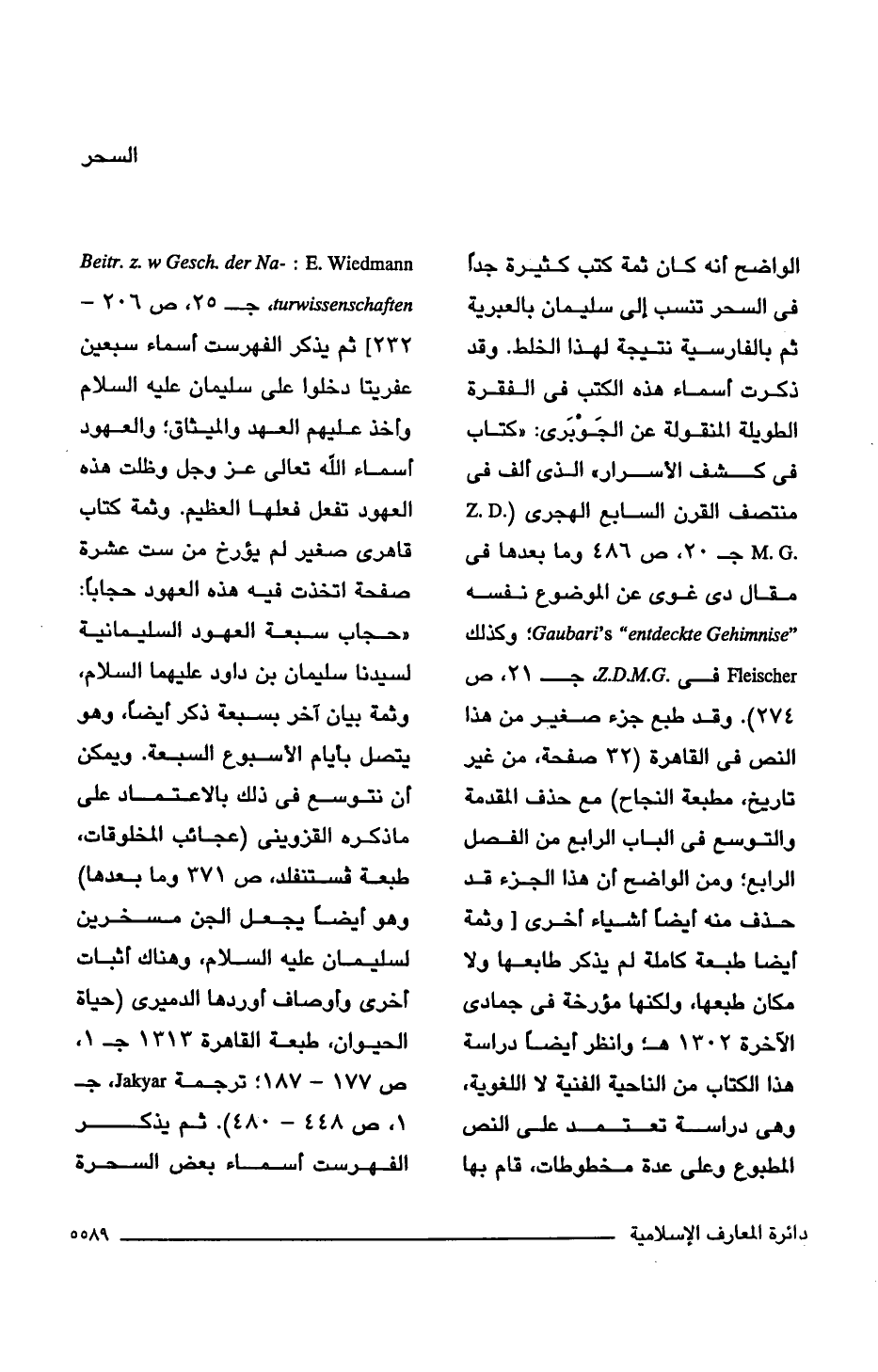 الواضح أنه كان ثمة كتب كثيرة جدًا فى السحر تنسب إلى سليمان بالعبرية ثم بالفارسية نتيجة لهذا الخلط. وقد ذكرت أسماء هذه الكتب فى الفقرة الطويلة المنقولة عن الجَوْبَرى: "كتاب فى كشف الأسرار" الذى ألف فى منتصف القرن السابع الهجرى (Z.D.M.G جـ 20، ص 486 وما بعدها فى مقال دى غوى عن الموضوع نفسه " Gaubari's "entdeckte Gehimnise؛ وكذلك Fleischer فى Z.D.M.G جـ 21، ص 274). وقد طبع جزء صغير من هذا النص فى القاهرة (32 صفحة، من غير تاريخ، مطبعة النجاح) مع حذف المقدمة والتوسع فى الباب الرابع من الفصل الرابع؛ ومن الواضح أن هذا الجزء قد حذف منه أيضًا أشياء أخرى [وثمة أيضًا طبعة كاملة لم يذكر طابعها ولا مكان طبعها، ولكنها مؤرخة فى جمادى الأخرة 1302 هـ وانظر أيضًا دراسة هذا الكتاب من الناحية الفنية لا اللغوية، وهى دراسة تعتمد على النص المطبوع وعلى عدة مخطوطات، قام بها Beitr.z. w Gesch. der Naturwissenschaften: E. Wiedmann، جـ 25 ص 206 - 232] ثم يذكر الفهرست أسماء سبعين عفريتا دخلوا على سليمان عليه السلام وأخذ عليهم العهد والميثاق؛ والعهود أسماء اللَّه تعالى عز وجل وظلت هذه العهود تفعل فعلها العظيم. وثمة كتاب قاهرى صغير لم يؤرخ من ست عشرة صفحة اتخذت فيه هذه العهود حجابًا: "حجاب سبعة العهود السليمانية لسيدنا سليمان بن داود عليهما السلام، وثمة بيان آخر بسبعة ذكر أيضًا، وهو يتصل بأيام الأسبوع السبعة. ويمكن أن نتوسع فى ذلك بالاعتماد على ما ذكره القزوينى (عجائب المخلوقات، طبعة فستنفلد، ص 371 وما بعدها) وهو أيضًا يجعل الجن مسخرين لسليمان عليه السلام، وهناك أثبات أخرى وأوصاف أوردها الدميرى (حياة الحيوان، طبعة القاهرة 1313 جـ 1، ص 177 - 178؛ ترجمة Jakyar جـ 1، ص 448 - 480). ثم يذكر الفهرست أسماء بعض السحرة