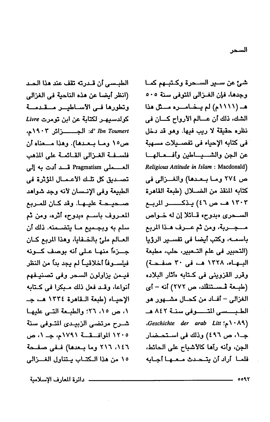 شئ عن سير السحرة وكتبهم كما وجدها، فإن الغزالى المتوفى سنة 505 هـ (1111 م) لم يخامره مثل هذا الشك، ذلك أن عالم الأرواح كان فى نظره حقيقة لا ريب فيها. وهو قد دخل فى كتابه الإحياء فى تفصيلات مسهبة عن الجن والشياطين وأفعالها (Religious Attitude in Islam: Macdonald ص 274 وما بعدها) والغزالى فى كتابه المنقذ من الضلال (طبعة القاهرة 1303 هـ، ص 46) يذكر المربع السحرى "بدوح" قائلا أن له خواص مجربة، ومن ثم عرف هذا المربع باسمه، وكتب أيضًا فى تفسير الرؤيا (التحبير فى علم التعبير، حلب، مطبعة البهاء، 1328 هـ، فى 30 صفحة) وقرر القزوينى فى كتابه "آثار البلاد" (طبعة فستنفلد، ص 272) أنه -أى الغزالى- أفاد من كحال مشهور هو الطبسى المتوفى سنة 842 هـ (1089 م؛ Geschichte der arab Litt, جـ 1، ص 496) وذلك فى استحضار الجن، وأنه رآها كالأشباح على الحائط، فلما أراد أن يتحدث معها أجابه الطبسى أن قدرته تقف عند هذا الحد (انظر أيضًا عن هذه الناحية فى الغزالى وتطورها فى الأساطير مقدمة كولدسيهر لكتابة عن ابن تومرت Livre d'lbn touert: الجزائر 1903 م، ص 15 وما بعدها). وهذا معناه أن فلسفة الغزالى القائمة على المذهب العملى Pragmatism قد أدت به إلى تصديق كل للك الأعمال المؤثرة فى الطبيعة وفى الإنسان لأنه وجد شواهد صحيحة عليها. وقد كان للمربع المعروف باسم "بدوح" أثره، ومن ثم سلم به وبجميع ما يتضمنه. ذلك أن العالم ملئ بالخفايا، وهذا المربع كان جزءًا منها على أنه بوصف كونه فيلسوفًا اخلاقيا لم يجد بدأ من النظر فيمن يزاولون السحر وفى تصنيفهم أنواعا، وقد فعل ذلك مبكرًا فى كتابه الإحياء (طبعة القاهرة 1334 هـ، جـ 1، ص 15) 26؛ والطبعة التى عليها شرح مرتضى الزبيدى المتوفى سنة 1205 الموافقة 1791 م، جـ 1، ص 146، 216 وما بعدها) ففى صفحة 15 من هذا الكتاب يتناول الغزالى