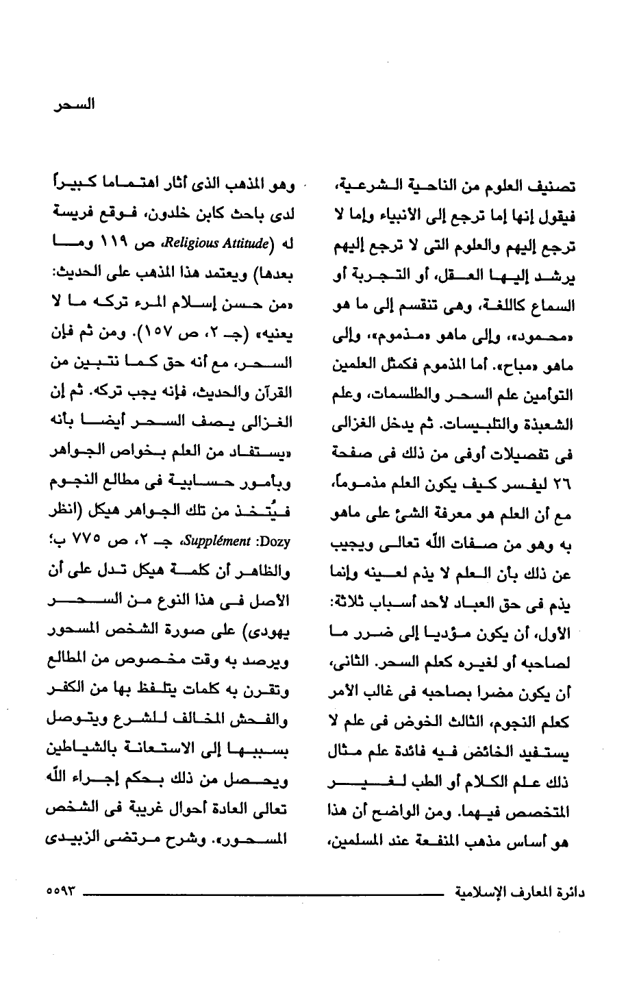 تصنيف العلوم من الناحية الشرعية، فيقول إنها إما ترجع إلى الأنبياء إما لا ترجع إليهم والعلوم التى لا ترجع إليهم يرشد إليها العقل، أو التجربة أو السماع كاللغة، وهى تنقسم إلى ما هو "محمود"، وإلى ما هو "مذموم"، وإلى ما هو "مباح". أما المذموم فكمثل العلمين التوأمين علم السحر والطلسمات، وعلم الشعبذة والتلبيسات. ثم يدخل الغزالى فى تفصيلات أو فى من ذلك فى صفحة 26 ليفسر كيف يكون العلم مذموما، مع أن العلم هو معرفة الشئ على ما هو به وهو من صفات اللَّه تعالى ويجيب عن ذلك بأن العلم لا يذم لعينه وإنما يذم فى حق العباد لأحد أسباب ثلاثة: الأول، أن يكون مؤديًا إلى ضرر ما لصاحبه أو لغيره كعلم السحر. الثانى، أن يكون مضرًا بصاحبه فى غالب الأمر كعلم النجوم، الثالث الخوض فى علم لا يستفيد الخائض فيه فائدة علم مثال ذلك علم الكلام أو الطب لغير المتخصص فيهما. ومن الواضح أن هذا هو أساس مذهب المنفعة عند المسلمين، وهو المذهب الذى أثار اهتمامًا كبيرًا لدى باحث كابن خلدون، فوقع فريسة له , (Religious Attitude، ص 119 وما بعدها) ويعتمد هذا المذهب على الحديث: "من حسن إسلام المرء تركه ما لا يعنيه" (جـ 2، ص 157). ومن ثم فإن السحر، مع أنه حق كما نتبين من القرآن والحديث، فإنه يجب تركه. ثم إن الغزالى يصف السحر أيضا بأنه "يستفاد من العلم بخواص الجواهر وبأمور حسابية فى مطالع النجوم فيُتخذ من للك الجواهر هيكل (انظر Supplement: Dozy، جـ 2، ص 775 ب؛ والظاهر أن كلمة هيكل تدل على أن الأصل فى هذا النوع من السحر يهودى) على صورة الشخص المسحور ويرصد به وقت مخصوص من المطالع وتقرن به كلمات يتلفظ بها من الكفر والفحش المخالف للشرع ويتوصل بسببها إلى الاستعانة بالشياطين ويحصل من ذلك بحكم إجراء اللَّه تعالى العادة أحوال غريبة فى الشخص المسحور". وشرح مرتضى الزبيدى