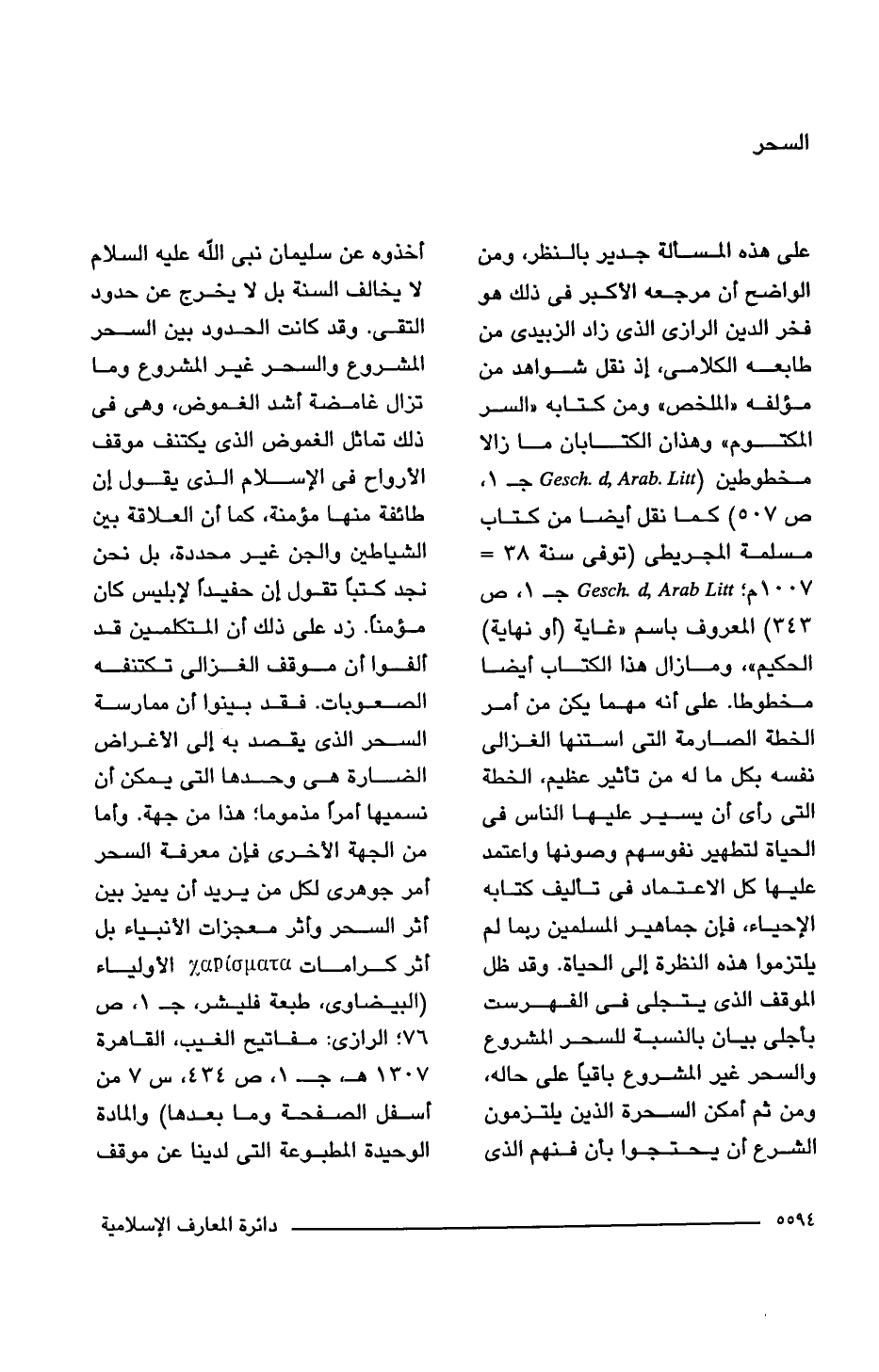على هذه المسألة جدير بالنظر، ومن الواضح أن مرجعه الأكبر فى ذلك هو فخر الدين الرازى الذى زاد الزبيدى من طابعه الكلامى، إذ نقل شواهد من مؤلفه "الملخص" ومن كتابه "السر المكتوم" وهذان الكتابان ما زالا مخطوطين (Gesch. d, Arab. Litt جـ 1، ص 507) كما نقل أيضا من كتاب مسلمة المجريطى (توفى سنة 38 = 1007 م؛ Gesch d, Arab Litt جـ 1، ص 343) المعروف باسم "غاية (أو نهاية) الحكيم"، وما زال هذا الكتاب أيضا مخطوطا. على أنه مهما يكن من أمر الخطة الصارمة التى استنها الغزالى نفسه بكل ما له من تأثير عظيم، الخطة التى رأى أن يسير عليها الناس فى الحياة لتطهير نفوسهم وصونها واعتمد عليها كل الاعتماد فى تأليف كتابه الإحياء، فإن جماهير المسلمين ربما لم يلتزموا هذه النظرة إلى الحياة. وقد ظل الموقف الذى يتجلى فى الفهرست بأجلى بيان بالنسبة للسحر المشروع والسحر غير المشروع باقيًا على حاله، ومن ثم أمكن السحرة الذين يلتزمون الشرع أن يحتجوا بأن فنهم الذى أخذوه عن سليمان نبى اللَّه عليه السلام لا يخالف السنة بل لا يخرج عن حدود التقى. وقد كانت الحدود بين السحر المشروع والسحر غير المشروع وما تزال غامضة أشد الغموض، وهى فى ذلك تماثل الغموض الذى يكتنف موقف الأرواح فى الإسلام الذى يقول إن طائفة منها مؤمنة، كما أن العلاقة بين الشياطين والجن غير محددة، بل نحن نجد كتبا تقول إن حفيدًا لإبليس كان مؤمنًا. زد على ذلك أن المتكلمين قد ألفوا أن موقف الغزالى تكتنفه الصعوبات. فقد بينوا أن ممارسة السحر الذى يقصد به إلى الأغراض الضارة هى وحدها التى يمكن أن نسميها أمرًا مذموما؛ هذا من جهة. وأما من الجهة الأخرى فإن معرفة السحر أمر جوهرى لكل من يريد أن يميز بين أثر السحر وأثر معجزات الأنبياء بل أثر كرامات (. . .) الأولياء (البيضاوى، طبعة فليشر، جـ 1، ص 76؛ الرازى: مفاتيح الغيب، القاهرة 1307 هـ، جـ 1، ص 434، س 7 من أسفل الصفحة وما بعدها) والمادة الوحيدة المطبوعة التى لدينا عن موقف