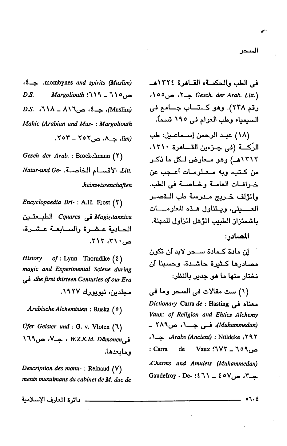 (1) ست مقالات فى السحر وما فى معناه فى Hasting: Dictionary Carra de Vaux: of Religion and Ehtics Alchemy (Muhammedan)، فى جـ 1، ص 289 - 292 Arabs (Ancient): Nbldeke , جـ 1، ص 659 - 673؛ Carra de Vaux: (Muhammedan) Charms and Amulets، جـ 3، ص 475 - 461؛ Gaudefroy - Demombynes and spirits (Muslim) جـ 4، ص 615 - 619؛ D.S. Margoliouth (Muslim)، جـ 4، ص 816 - 618 D.S. Mahic (Arabian and Muslim: Margoliouth، جـ 8، ص 252 - 253.