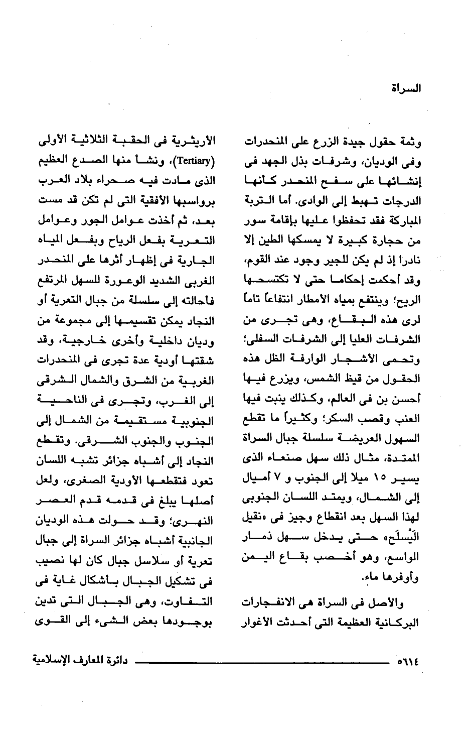 وثمة حقول جيدة الزرع على المنحدرات وفى الوديان، وشرفات بذل الجهد فى إنشائها على سفح المنحدر كأنها الدرجات تهبط إلى الوادى. أما التربة المباركة فقد تحفظوا عليها بإقامة سور من حجارة كبيرة لا يمسكها الطين إلا نادرا إذ لم يكن للجير وجود عند القوم، وقد أحكمت إحكاما حتى لا تكتسحها الريح؛ وينتفع بمياه الأمطار انتفاعًا تامًا لرى هذه البقاع، وهى تجرى من الشرفات العليا إلى الشرفات السفلى؛ وتحمى الأشجار الوارفة الظل هذه الحقول من قيظ الشمس، ويزرع فيها أحسن بن فى العالم، وكذلك ينبت فيها العنب وقصب السكر؛ وكثيرًا ما تقطع السهول العريضة سلسلة جبال السراة الممتدة، مثال ذلك سهل صنعاء الذى يسير 15 ميلا إلى الجنوب و 7 أميال إلى الشمال، ويمتد اللسان الجنوبى لهذا السهل بعد انقطاع وجيز فى "نقيل الَيْسلَح" حتى يدخل سهل ذمار الواسع، وهو أخصب بقاع اليمن وأوفرها ماء.