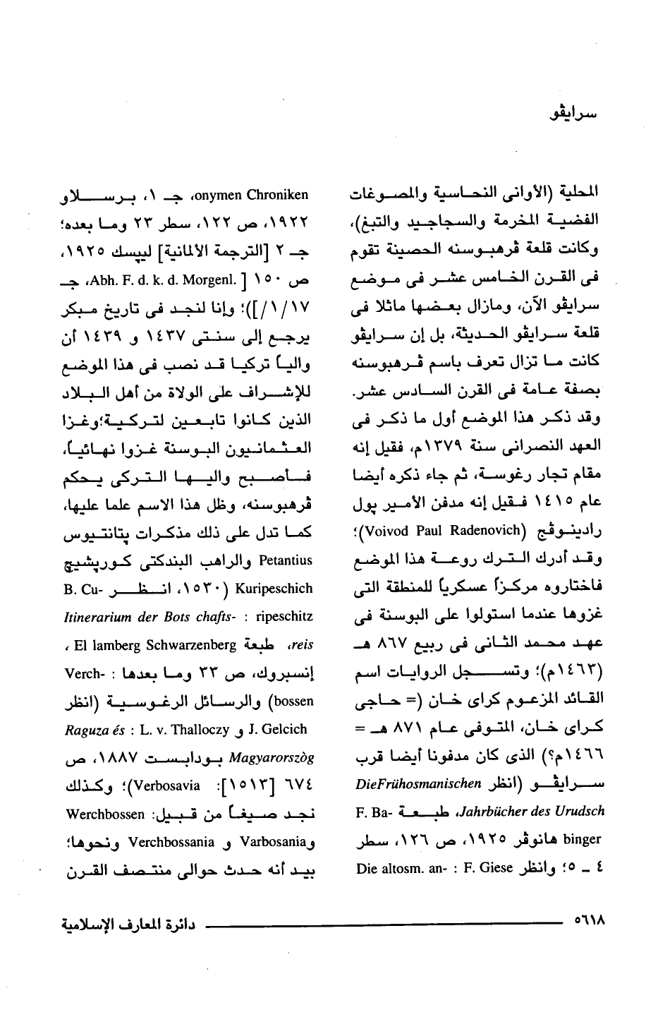 المحلية (الأوانى النحاسية والمصوغات الفضية المخرمة والسجاجيد والتبغ)، وكانت قلعة فرهبوسنه الحصينة تقوم فى القرن الخامس عشر فى موضع سرايفو الآن، وما زال بعضها ماثلا فى قلعة سرايفو الحديثة، بل إن سرايفو كانت ما تزال تعرف باسم فرهبوسنه بصفة عامة فى القرن السادس عشر. وقد ذكر هذا الموضع أول ما ذكر فى العهد النصرانى سنة 1379 م، فقيل إنه مقام تجار رغوسة، ثم جاء ذكره أيضا عام 1415 فقيل إنه مدفن الأمير بول رادينوفج (Voivod Paul Radenovich)؛ وقد أدرك الترك روعة هذا الموضع فاختاروه مركزًا عسكريًا للمنطقة التى غزوها عندما استولوا على البوسنة فى عهد محمد الثانى فى ربيع (1463 م)؛ وتسجل الروايات اسم القائد المزعوم كراى خان (= حاجى كراى خان، المتوفى عام 871 هـ = 1466 م) الذى كان مدفونًا أيضًا قرب سرايفو (انظر DieFruhosmanischen Jahrbucher des Urudsch طبعة F. Babinger هانوفر 1925، ص 126، سطر 4 - 5؛ وانظر Die altosm. anonymen Chroniken: F.Giese , جـ 1، برسلاو 1922، ص 122، سطر 23 ما بعده؛ جـ 2 [الترجمة الألمانية] ليبسك 1925، ص 150 [Abh. F. d. k. d. Morgenl جـ 17/ 1])؛ وإنا لنجد فى تاريخ مبكر يرجع إلى سنتى 1437 و 1439 أن واليًا تركيا قد نصب فى هذا الموضع للإشراف على الولاة من أهل البلاد الذين كانوا تابعين لتركية؛ وغزا العثمانيون البوسنة غزوا نهائيًا، فأصبح واليها التركى يحكم فرهبوسنه، وظل هذا الاسم علما عليها، كما تدل على ذلك مذكرات بتانتيوس Petantius والراهب البندكتى كوربشيج Kuripeschich (1530، انظر B. Curipeschitz: Itinerarium der Bots chaftsreis, طبعة El lamberg Schwarzenberg إنسبروك، ص 33 وما بعدها: Verch bossen) والرسائل الرغوسية (انظر J. Gelcich و Raguza es: L. v. Thalloczy Magyarorszbg بودابست 1887، ص 674 [1513]: Verbosavia)؛ وكذلك نجد صيغًا من قبيل: Werchbossen و Varbosania و Verchbossania ونحوها، بيد أنه حدث حوالى منتصف القرن