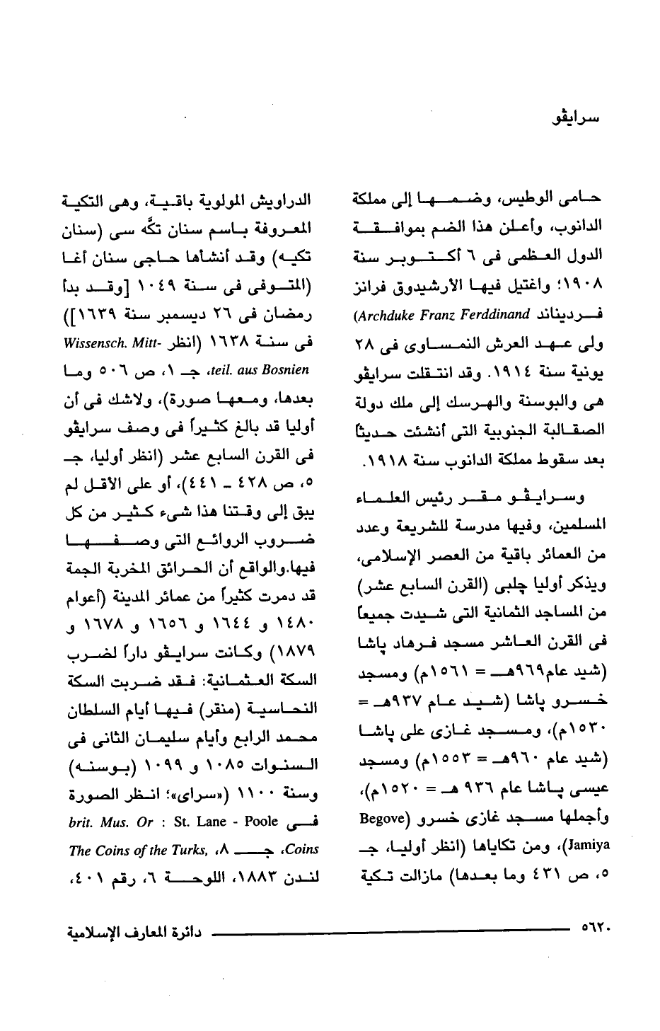 وسرايفو مقر رئيس العلماء المسلمين، وفيها مدرسة للشريعة وعدد من العمائر باقية من العصر الإسلامى، ويذكر أوليا جلبى (القرن السابع عشر) من المساجد الثمانية التى شيدت جميعا فى القرن العاشر مسجد فرهاد باشا (شيد عام 969 هـ = 1561 م) ومسجد خسرو باشا (شيد عام 937 هـ = 1530 م)، ومسجد غازى على باشا (شيد عام 960 هـ = 1553 م) ومسجد عيسى باشا عام 936 هـ = 1520 م)، وأجملها مسجد غازى خسرو (Begove Jamiya)، ومن تكاياها (انظر أوليا، جـ 5، ص 431 وما بعدها) ما زالت تكية الدراويش المولوية باقية، وهى التكية المعروفة باسم سنان تكَّه سى (سنان تكيه) وقد أنشاها حاجى سنان أغا (المتوفى فى سنة 1049 [وقد بدأ رمضان فى 26 ديسمبر سنة 1639]) فى سنة 1638 (انظر Wyssensch.Mitteil. aus Bosnien، جـ 1، ص 506 وما بعدها، ومعها صورة)، ولا شك فى أن أوليا قد بالغ كثيرًا فى وصف سرايفو فى القرن السابع عشر (انظر أوليا، جـ 5، ص 428 - 441)، أو على الأقل لم يبق إلى وقتنا هذا شئ كثير من كل ضروب الروائع التى وصفها فيها. والواقع أن الحرائق المخربة الجمة قد دمرت كثيرًا من عمائر المدينة أعوام 1480 و 1644 و 1656 و 1678 و 1879) وكانت سرايفو دارًا لضرب السكة العثمانية: فقد ضربت السكة النحاسية (منقر) فيها أيام السلطان محمد الرابع وأيام سليمان الثانى فى السنوات 1085 و 1099 (بوسنه) وسنة 1100 ("سراى"؛ انظر الصورة فى brit. Mus. Or Coins: St. Lane-Poole, جـ 8، The Coins of the Turks, لندن 1883. اللوحة 6، رقم 401،