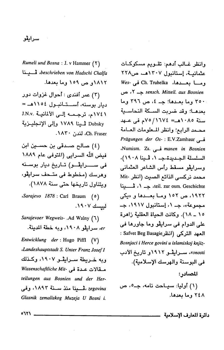 وانظر غالب أدهم: تقويم مسكوكات عثمانية، إستانبول 1307 هـ، ص 228 وما بعدها، Ch. Truhelka، فى Wessensch. Mitteil. aus Bosnien، جـ 2، ص 350 وما بعدها؛ جـ 4، ص 369 وما بعدها؛ وقد ضربت السكة النحاسية سنة 1085 هـ = 1674/ 75 م فى عهد محمد الرابع؛ وانظر المعلومات العامة فى Pragungen der Osmanen in Rn.cnien: E.V.Zambaur فى Numism. Zs, السلسلة الجديدة، جـ 1، فينا 1908)، وسرايفو مسقط رأس الشاعر العثمانى محمد نركسى الذائع الصيت (انظر Mitteil. zur osm. Geschichte، جـ 1، فينا 1922، ص 152 وما بعدها و"يكى مجموعة"، جـ 1، إستانبول 1917، جـ 15 - 18). وكانت الحياة العقلية زاهرة على الدوام فى سرايفو وما جاورها فى العهد التركى (انظر Safvet Beg Basagie: Bosnjaci i Herce govini u islamiskoj knjizronosti، سرايفو 1912 وتاريخ الأدب فى البوسنة والهرسك الإسلامية).