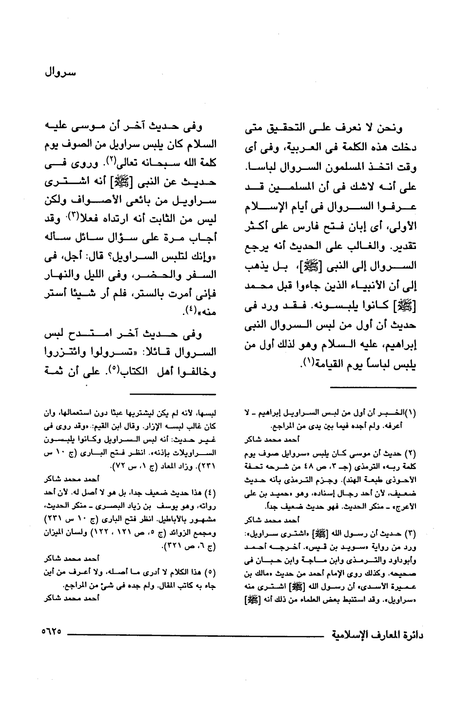 ونحن لا نعرف على التحقيق متى دخلت هذه الكلمة فى العربية، وفى أى وقت اتخذ المسلمون السروال لباسا. على أنه لا شك فى أن المسلمين قد عرفوا السروال فى أيام الإسلام الأولى، أى إبان فتح فارس على أكثر تقدير. والغالب على الحديث أنه يرجع السروال إلى النبى [-صلى اللَّه عليه وسلم-]، بل يذهب إلى أن الأنبياء الذين جاءوا قبل محمد [-صلى اللَّه عليه وسلم-] كانوا يلبسونه. فقد ورد فى حديث أن أول من لبس السروال النبى إبراهيم، عليه السلام وهو لذلك أول من يلبس لباسًا يوم القيامة (¬1).