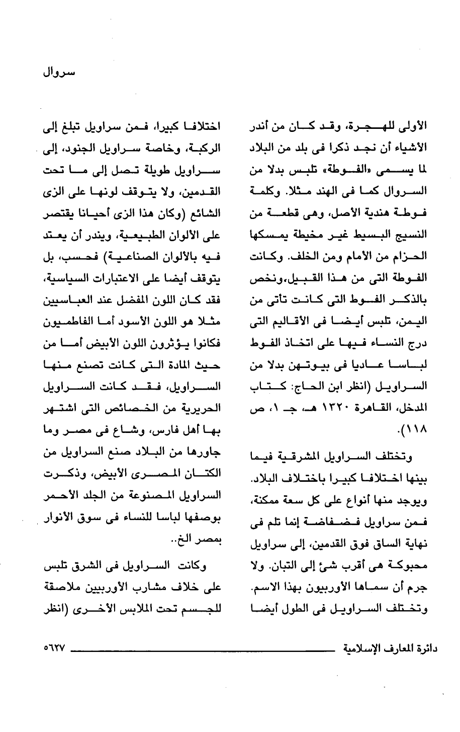 الأولى للهجرة، وقد كان من أندر الأشياء أن نجد ذكرا فى بلد من البلاد لما يسمى "الفوطة" للبس بدلا من السروال كما فى الهند مثلا. وكلمة فوطة هندية الأصل، وهى قطعة من النسيج البسيط غير مخيطة يمسكها الحزام من الأمام ومن الخلف. وكانت الفوطة التى من هذا القبيل، ونخص بالذكر الفوط التى كانت تأتى من اليمن، للبس أيضا فى الأقاليم التى درج النساء فيها على اتخاذ الفوط لباسا عاديا فى بيوتهن بدلا من السراويل (انظر ابن الحاج: كتاب المدخل، القاهرة 1320 هـ، جـ 1، ص 118).