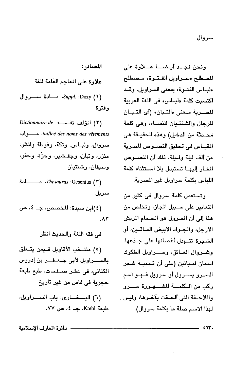 (2) المؤلف نفسه Dictionnaire de taillee des noms des vetements, مواد: سروال، ولباس. وتكة، وفوطة وانظر: مئزر، وتبان، وجقشير، وحزّة، وحقو، وسيقان، وشنتيان