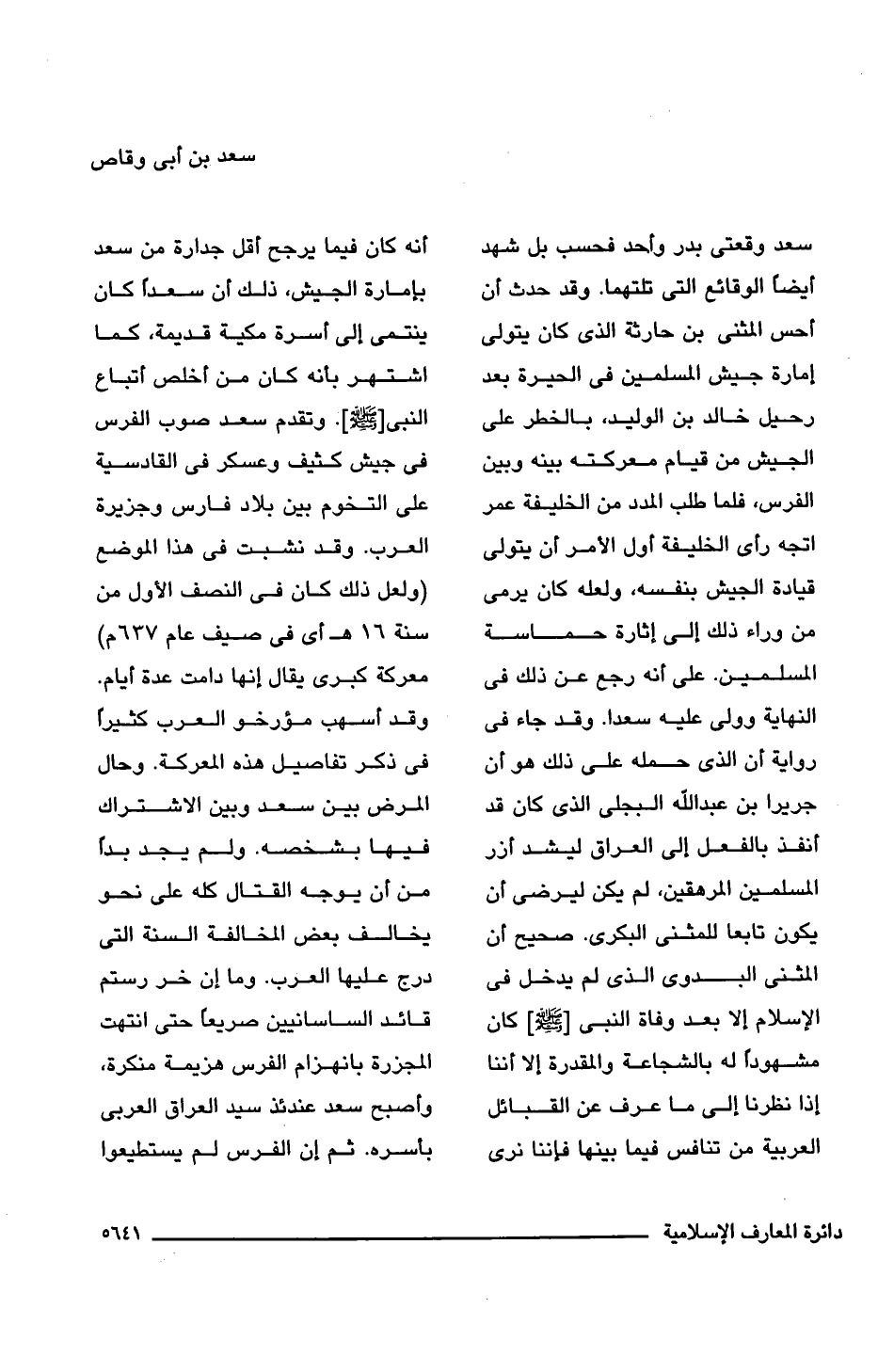 سعد وقعتى بدر وأحد فحسب بل شهد أيضًا الوقائع التى تلتهما. وقد حدث أن أحس المثنى بن حارثة الذى كان يتولى إمارة جيش المسلمين فى الحيرة بعد رحيل خالد بن الوليد، بالخطر على الجيش من قيام معركته بينه وبين الفرس، فلما طلب المدد من الخليفة عمر اتجه رأى الخليفة أول الأمر أن يتولى قيادة الجيش بنفسه، ولعله كان يرمى من وراء ذلك إلى إثارة حماسة المسلمين. على أنه رجع عن ذلك فى النهاية وولى عليه سعدا. وقد جاء فى رواية أن الذى حمله على ذلك هو أن جريرا بن عبد اللَّه البجلى الذى كان قد أنفذ بالفعل إلى العراق ليشد أزر المسلمين المرهقين، لم يكن ليرضى أن يكون تابعا للمثنى البكرى. صحيح أن المثنى البدوى الذى لم يدخل فى الإسلام إلا بعد وفاة النبى [-صلى اللَّه عليه وسلم-] كان مشهودًا له بالشجاعة والمقدرة إلا أننا إذا نظرنا إلى ما عرف عن القبائل العربية من تنافس فيما بينها فإننا نرى أنه كان فيما يرجح أقل جدارة من سعد بإمارة الجيش، ذلك أن سعدًا كان ينتمى إلى أسرة مكية قديمة، كما اشتهر بأنه كان من أخلص أتباع النبى [-صلى اللَّه عليه وسلم-]. وتقدم سعد صوب الفرس فى جيش كثيف وعسكر فى القادسية على التخوم بين بلاد فارس وجزيرة العرب. وقد نشبت فى هذا الموضع (ولعل ذلك كان فى النصف الأول من سنة 16 هـ أى فى صيف عام 637 م) معركة كبرى يقال إنها دامت عدة أيام. وقد أسهب مؤرخو العرب كثيرا فى ذكر تفاصيل هذه المعركة. وحال المرض بين سعد وبين الاشتراك فيها بشخصه. ولم يجد بدًا من أن يوجه القتال كله على نحو يخالف بعض المخالفة السنة التى درج عليها العرب. وما إن خر رستم قائد الساسانيين صريعًا حتى انتهت المجزرة بانهزام الفرس هزيمة منكرة، وأصبح سعد عندئذ سيد العراق العربى بأسره. ثم إن الفرس لم يستطيعوا