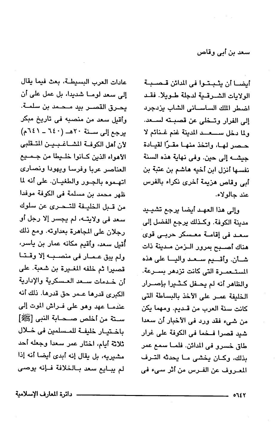 وإلى هذا العهد أيضًا يرجع تشييد مدينة الكوفة. وكذلك يرجع الفضل إلى سعد فى إقامة معسكر حربى قوى هناك أصبح بمرور الزمن مدينة ذات شأن. وأقيم سعد واليا على هذه المستعمرة التى كانت تزدهر بسرعة. والظاهر أنه لم يحفل كثيرا بإصرار الخليفة عمر على الأخذ بالبساطة التى كانت سنة العرب من قديم. ومهما يكن من شئ فقد ورد فى الأخبار أن سعدًا شيد قصرا فخما فى الكوفة على غرار طاق خسرو فى المدائن. فلما سمع عمر بذلك، وكان يخشى ما يحدثه الترف المعروف عن الفرس من أثر سئ فى عادات العرب البسيطة، بعث فيما يقال إلى سعد لومًا شديدًا، بل عمل على أن يحرق القصر بيد محمد بن سلمة. وأقيل سعد من منصبه فى تاريخ مبكر يرجع إلى سنة 20 هـ (640 - 641 م) لأن أهل الكوفة المشاغبين المتقلبى الأهواء الذين كانوا خليطا من جميع العناصر عربا وفرسا ويهودا ونصارى اتهموه بالجور والطغيان. على أنه لما ظهر محمد بن مسلمة فى الكوفة موفدا من قبل الخليفة للتحرى عن سلوك سعد فى ولايته، لم يجسر إلا رجل أو رجلان على المجاهرة بعداوته. ومع ذلك أقيل سعد، وأقيم مكانه عمار بن ياسر، ولم يبق عمار فى منصبه إلا وقتا قصيرا ثم خلفه المغيرة بن شعبة. على أن خدمات سعد العسكرية والإدارية الكبرى قدرها عمر حق قدرها. ذلك أنه عندما عهد وهو على فراش الموت إلى ستة من أخلص صحابة النبى [-صلى اللَّه عليه وسلم-] باختيار خليفة للمسلمين فى خلال ثلاثة أيام، اختار عمر سعدا وجعله أحد مشيريه، بل يقال إنه أبدى أيضًا أنه إذا لم يبايع سعد بالخلافة فإنه يوصى