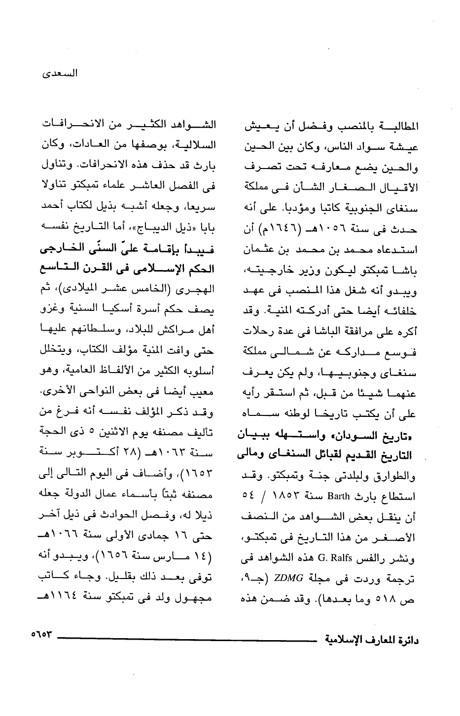 المطالبة بالمنصب وفضل أن يعيش عيشة سواد الناس، وكان بين الحين والحين يضع معارفه تحت تصرف الأقيال الصغار الشأن فى مملكة سنغاى الجنوبية كاتبا ومؤدبا. على أنه حدث فى سنة 1056 هـ (1646 م) أن استدعاه محمد بن محمد بن عثمان باشا تمبكتو ليكون وزير خارجيته، ويبدو أنه شغل هذا المنصب فى عهد خلفائه أيضًا حتى أدركته المنية. وقد أكره على مرافقة الباشا فى عدة رحلات فوسع مداركه عن شمالى مملكة سنغاى وجنوبيها، ولم يكن يعرف عنهما شيئا من قبل، ثم استقر رأيه على أن يكتب تاريخا لوطنه سماه "تاريخ السودان" واستهله ببيان التاريخ القديم لقبائل السنغاى ومالى والطوارق ولبلدتى جنة وتمبكتو. وقد استطاع بارث Barth سنة 1853/ 54 أن ينقل بعض الشواهد من النصف الأصغر من هذا التاريخ فى تمبكتو، ونشر رالفس G. Ralfs هذه الشواهد فى ترجمة وردت فى مجلة ZDMG (جـ 9، ص 518 وما بعدها). وقد ضمن هذه الشواهد الكثير من الانحرافات السلالية، بوصفها من العادات، وكان بارث قد حذف هذه الانحرافات. وتناول فى الفصل العاشر علماء تمبكتو تناولا سريعا، وجعله أشبه بذيل لكتاب أحمد بابا "ذيل الديباج"، أما التاريخ نفسه فيبدأ بإقامة على السنى الخارجى الحكم الإسلامى فى القرن التاسع الهجرى (الخامس عشر الميلادى)، ثم يصف حكم أسرة أسكيا السنية وغزو أهل مراكش للبلاد، وسلطانهم عليها حتى وافت المنية مؤلف الكتاب، ويتخلل أسلوبه الكثير من الألفاظ العامية، وهو معيب أيضًا فى بعض النواحى الأخرى. وقد ذكر المؤلف نفسه أنه فرغ من تأليف مصنفه يوم الاثنين 5 ذى الحجة سنة 1063 هـ (28 أكتوبر سنة 1653)، وأضاف فى اليوم التالى إلى مصنفه ثبتا بأسماء عمال الدولة جعله ذيلا له، وفصل الحوادث فى ذيل آخر حتى 16 جمادى الأولى سنة 1066 هـ (14 مارس سنة 1656)، ويبدو أنه توفى بعد ذلك بقليل. وجاء كاتب مجهول ولد فى تمبكتو سنة 1164 هـ