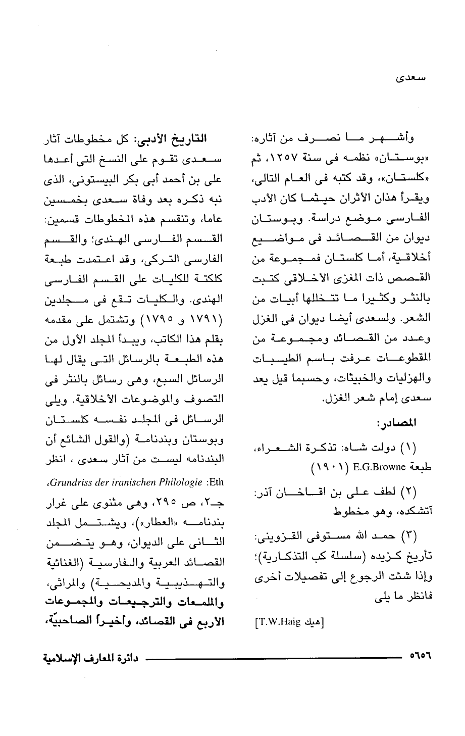 التاريخ الأدبى: كل مخطوطات آثار سعدى تقوم على النسخ التى أعدها على بن أحمد أبى بكر البيستونى، الذى نبه ذكره بعد وفاة سعدى بخمسين عاما، وتنقسم هذه المخطوطات قسمين: القسم الفارسى الهندى؛ والقسم الفارسى التركى، وقد اعتمدت طبعة كلكتة للكليات على القسم الفارسى الهندى. والكليات تقع فى مجلدين (1791 و 1795) وتشتمل على مقدمه بقلم هذا الكاتب، ويبدأ المجلد الأول من هذه الطبعة بالرسائل التى يقال لها الرسائل السبع، وهى رسائل بالنثر فى التصوف والموضوعات الأخلاقية. ويلى الرسائل فى المجلد نفسه كلستان وبوستان وبندنامة (والقول الشائع أن البندنامه ليست من آثار سعدى، انظر Grundriss der iranischen Philologie: Eth, جـ 3، ص 295، وهى مثنوى على غرار بندنامه "العطار")، ويشتمل المجلد الثانى على الديوان، وهو يتضمن القصائد العربية والفارسية (الغنائية والتهذيبية والمديحية) والمراثى، والملمعات والترجيعات والمجموعات الأربع فى القصائد، وأخيرًا الصاحبيّة،