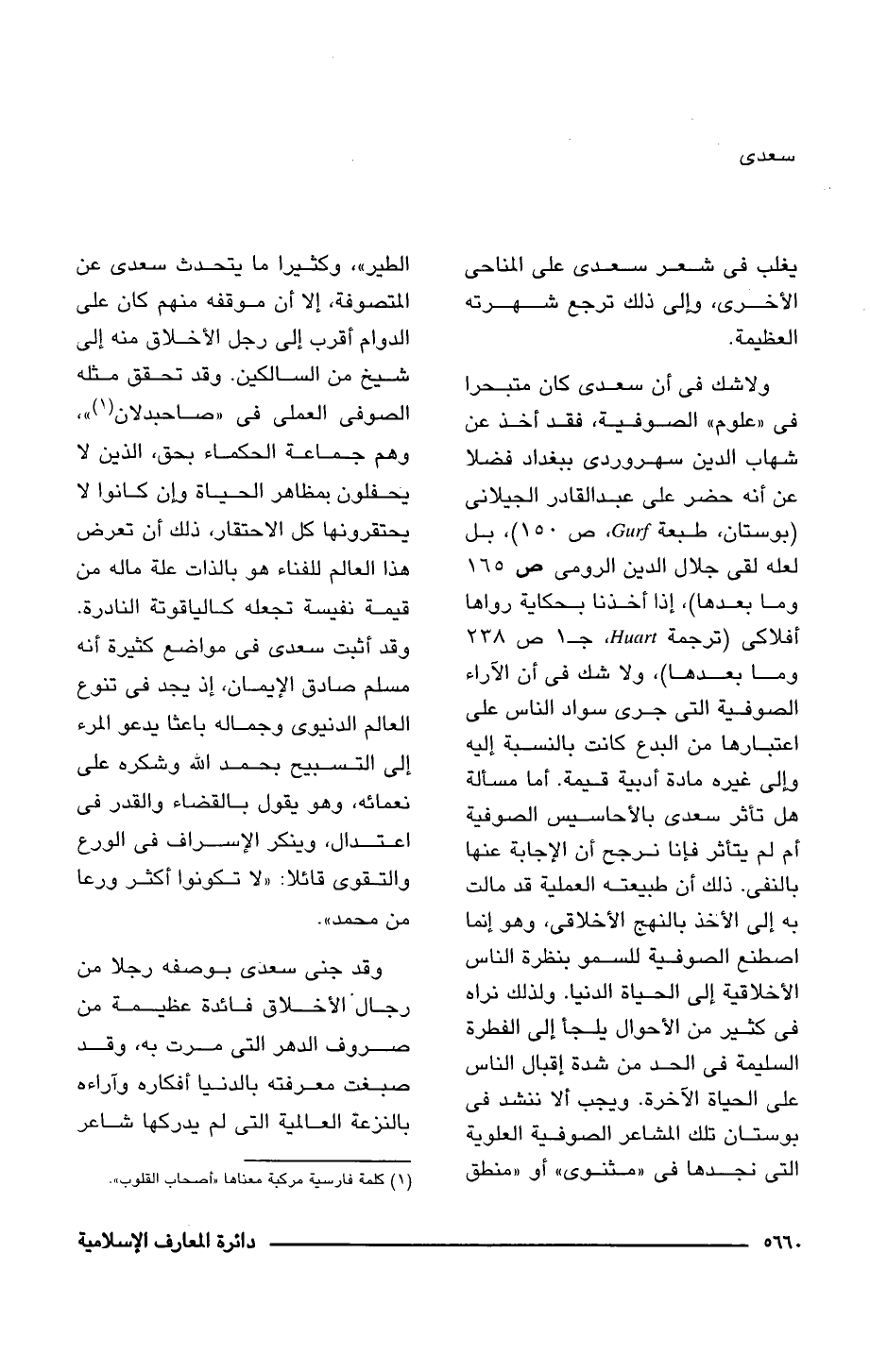 ولاشك فى أن سعدى كان متبحرا فى "علوم" الصوفية، فقد أخذ عن شهاب الدين سهروردى ببغداد فضلا عن أنه حضر على عبد القادر الجيلانى (بوستان، طبعة Gurf، ص 150)، بل لعله لقى جلال الدين الرومى ص 165 وما بعدها)، إذا أخذنا بحكاية رواها أفلاكى (ترجمة Huart، جـ 1 ص 238 وما بعدها)، ولا شك فى أن الآراء الصوفية التى جرى سواد الناس على اعتبارها من البدع كانت بالنسبة إليه وإلى غيره مادة أدبية قيمة. أما مسألة هل تأثر سعدى بالأحاسيس الصوفية أم لم يتأثر فإنا نرجح أن الإجابة عنها بالنفى. ذلك أن طبيعته العملية قد مالت به إلى الأخذ بالنهج الأخلاقى، وهو إنما اصطنع الصوفية للسمو بنظرة الناس الأخلاقية إلى الحياة الدنيا. ولذلك نراه فى كثير من الأحوال يلجأ إلى الفطرة السليمة فى الحد من شدة إقبال الناس على الحياة الآخرة. ويجب ألا ننشد فى بوستان تلك المشاعر الصوفية العلوية التى نجدها فى "مثنوى" أو "منطق الطير"، وكثيرا ما يتحدث سعدى عن المتصوفة، إلا أن موقفه منهم كان على الدوام أقرب إلى رجل الأخلاق منه إلى شيخ من السالكين. وقد تحقق مثله الصوفى العملى فى "صاحبدلان (¬1) "، وهم جماعة الحكماء بحق، الذين لا يحفلون بمظاهر الحياة وإن كانوا لا يحتقرونها كل الاحتقار، ذلك أن تعرض هذا العالم للفناء هو بالذات علة ماله من قيمة نفيسة تجعله كالياقوتة النادرة. وقد أثبت سعدى فى مواضع كثيرة أنه مسلم صادق الإيمان، إذ يجد فى تنوع العالم الدنيوى وجماله باعثا يدعو المرء إلى التسبيح بحمد اللَّه وشكره على نعمائه، وهو يقول بالقضاء والقدر فى اعتدال، وينكر الإسراف فى الورع والتقوى قائلا: "لا تكونوا أكثر ورعا من محمد".