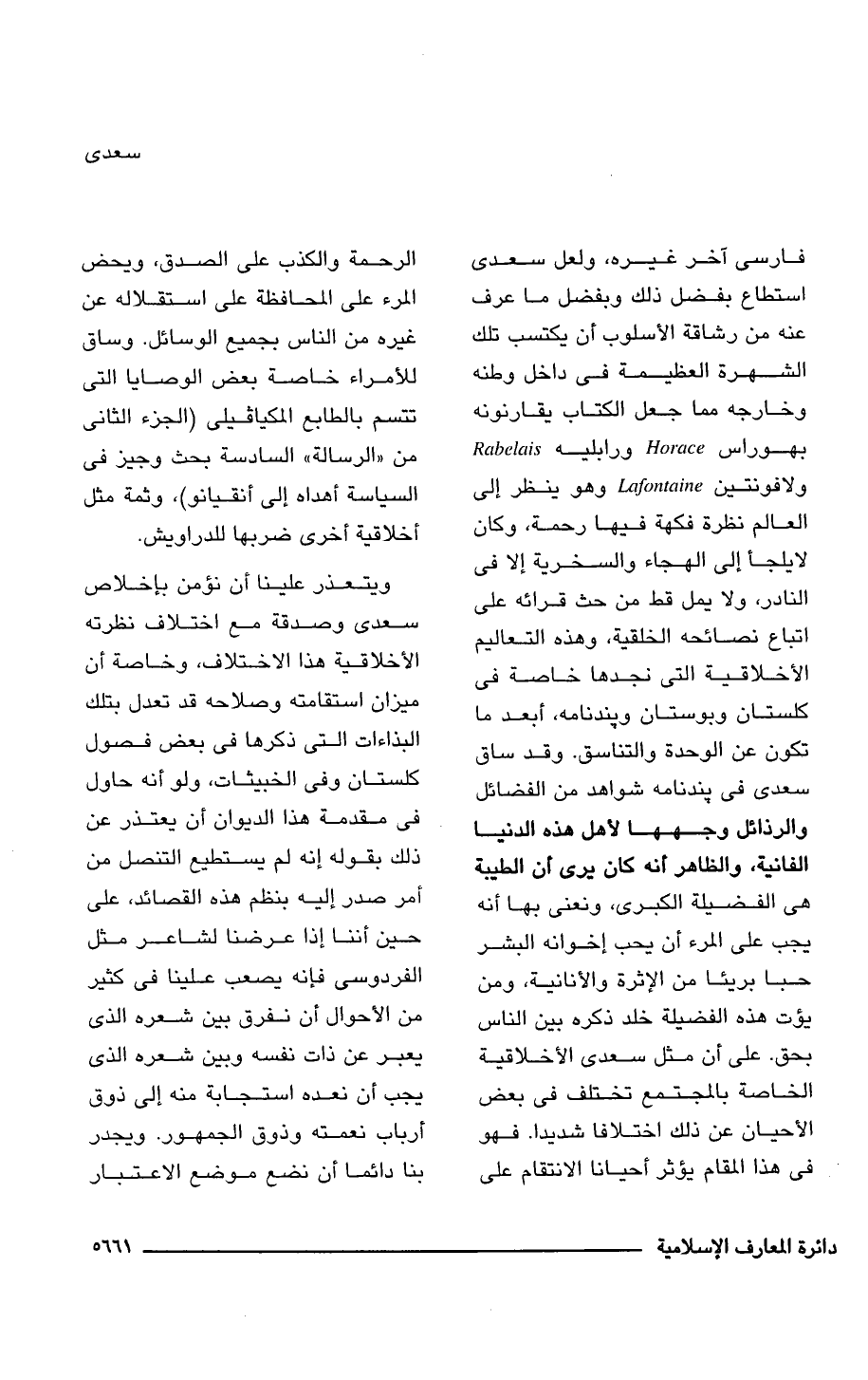 فارسى آخر غيره، ولعل سعدى استطاع بفضل ذلك وبفضل ما عرف عنه من رشاقة الأسلوب أن يكتسب تلك الشهرة العظيمة فى داخل وطنه وخارجه مما جعل الكتاب يقارنونه بهوراس Horace ورابليه Rabelais ولافونتين Lafontaine وهو ينظر إلى العالم نظرة فكهة فيها رحمة، وكان لا يلجأ إلى الهجاء والسخرية إلا فى النادر، ولا يمل قط من حث قرائه على اتباع نصائحه الخلقية، وهذه التعاليم الأخلاقية التى نجدها خاصة فى كلستان وبوستان ويندنامه، أبعد ما تكون عن الوحدة والتناسق. وقد ساق سعدى فى بندنامه شواهد من الفضائل والرذائل وجهها لأهل هذه الدنيا الفانية، والظاهر أنه كان يرى أن الطيبة هى الفضيلة الكبرى، ونعنى بها أنه يجب على المرء أن يحب إخوانه البشر حبا بريئا من الإثرة والأنانية، ومن يؤت هذه الفضيلة خلد ذكره بين الناس بحق. على أن مثل سعدى الأخلاقية الخاصة بالمجتمع تختلف فى بعض الأحيان عن ذلك اختلافا شديدا. فهو فى هذا المقام يؤثر أحيانا الانتقام على الرحمة والكذب على الصدق، ويحض المرء على المحافظة على استقلاله عن غيره من الناس بجميع الوسائل. وساق للأمراء خاصة بعض الوصايا التى تتسم بالطابع المكيافيلى (الجزء الثانى من "الرسالة" السادسة بحث وجيز فى السياسة أهداه إلى أنقيانو)، وثمة مثل أخلاقية أخرى ضربها للدراويش.