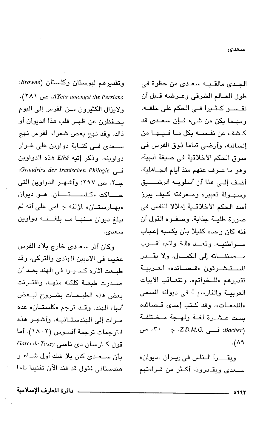 الجدى مالقيه سعدى من حظوة فى طول العالم الشرقى وعرضه قبل أن نقسو كثيرا فى الحكم على خلقه. ومهما يكن من شئ فإن سعدى قد كشف عن نفسه بكل ما فيها من إنسانية، وأرضى تماما ذوق الفرس فى سوق الحكم الأخلاقية فى صيغة أدبية، وهو ما عرف عنهم منذ أيام الجاهلية، أضف إلى هذا أن أسلوبه الرشيق وسهولة تعبيره ومعرفته كيف يبرز أشد الحكم الأخلاقية إملالا للنفس فى صورة طلية جذابة. وصفوة القول أن فنه كان وحده كفيلا بأن يكسبه إعجاب مواطنيه. وتعد "الخواتم" أقرب مصنفاته إلى الكمال، ولا يقدر المستشرقون "قصائده" العربية تقديرهم "للخواتم". وتتعاقب الأبيات العربية والفارسية فى ديوانه المسمى "الملمعات"، وقد كتب إحدى قصائده بست عشرة لغة ولهجة مختلفة (Bacher: فى Z.D.M.G، جـ 30، ص 89).