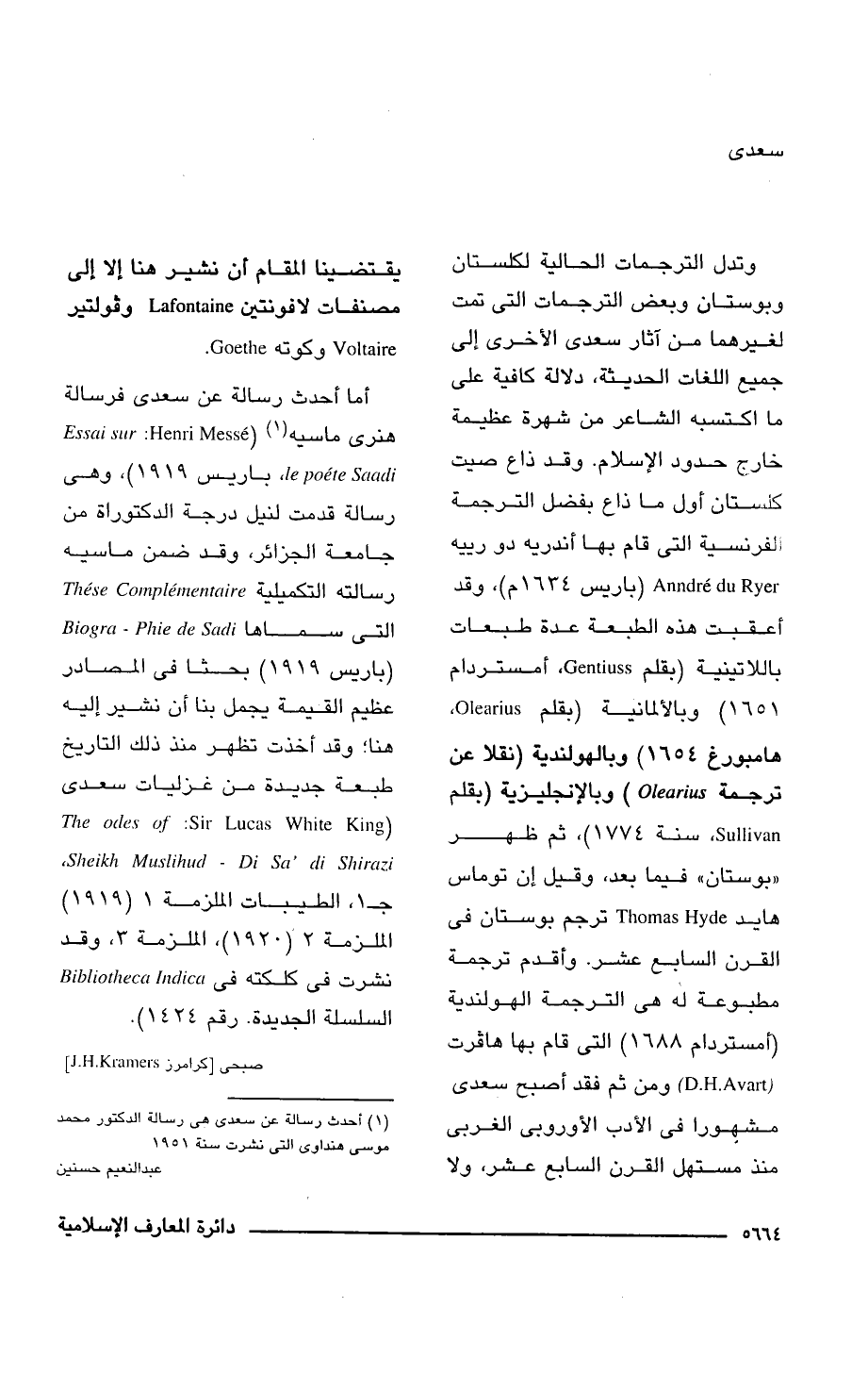 أما أحدث رسالة عن سعدى فرسالة هنرى ماسيه (¬1) (Essai sur le poete Saad: Henri Messe, باريس 1918)، وهى رسالة قدمت لنيل درجة الدكتوراة من جامعة الجزائر، وقد ضمن ماسيه رسالته التكميلية These Complementaire التى سماها Biogra-Phie de Sadi (باريس 1919) بحثا فى المصادر عظيم القيمة يجمل بنا أن نشير إليه هنا؛ وقد أخذت تظهر منذ ذلك التاريخ طبعة جديدة من غزليات سعدى The odes of Sheikh Muslihud-Di Sa'di Shirazi: Sir Lucas White King, جـ 1، الطيبات الملزمة 1 (1919) الملزمة 2 (1920) الملزمة 3، وقد نشرت فى كلكته فى Bibliotheca Indica السلسلة الجديدة. رقم 1424).