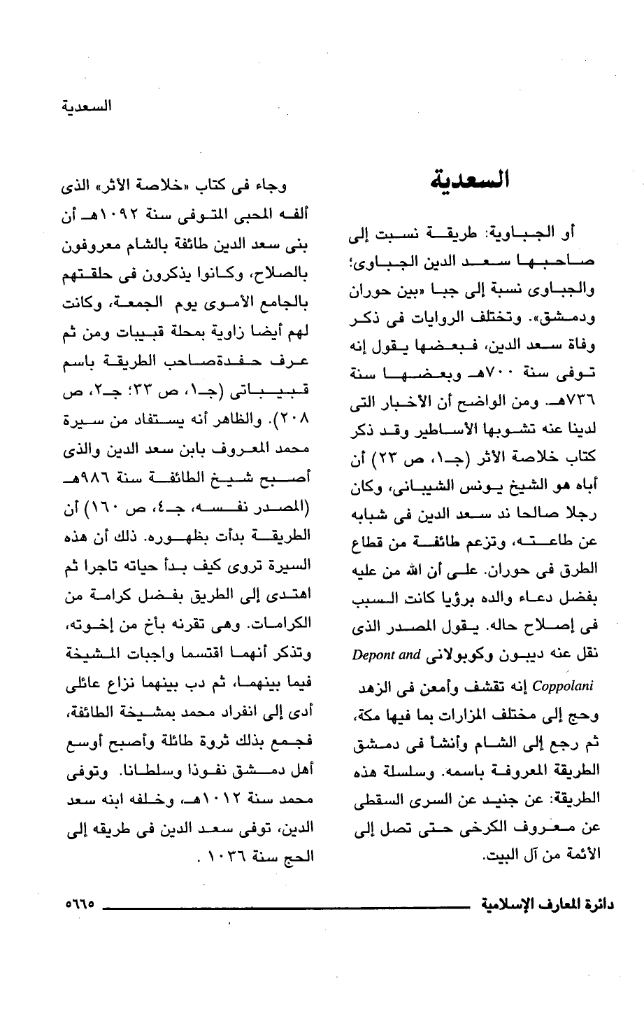 وجاء فى كتاب "خلاصة الأثر" الذى ألفه المحبى المتوفى سنة 1092 هـ أن بنى سعد الدين طائفة بالشام معروفون بالصلاح، وكانوا يذكرون فى حلقتهم بالجامع الأموى يوم الجمعة، وكانت لهم أيضًا زاوية بمحلة قبيبات ومن ثم عرف حفدة صاحب الطريقة باسم قبيباتى (جـ 1، ص 33؛ جـ 2، ص 208). والظاهر أنه يستفاد من سيرة محمد المعروف بابن سعد الدين والذى أصبح شيخ الطائفة سنة 986 هـ (المصدر نفسه، جـ 4، ص 160) أن الطريقة بدأت بظهوره. ذلك أن هذه السيرة تروى كيف بدأ حياته تاجرا ثم اهتدى إلى الطريق بفضل كرامة من الكرامات. وهى تقرنه بأخ من إخوته، وتذكر أنهما اقتسما واجبات المشيخة فيما بينهما، ثم دب بينهما نزاع عائلى أدى إلى انفراد محمد بمشيخة الطائفة، فجمع بذلك ثروة طائلة وأصبح أوسع أهل دمشق نفوذا وسلطانا. وتوفى محمد سنة 1012 هـ وخلفه ابنه سعد الدين، توفى سعد الدين فى طريقه إلى الحج سنة 1036.