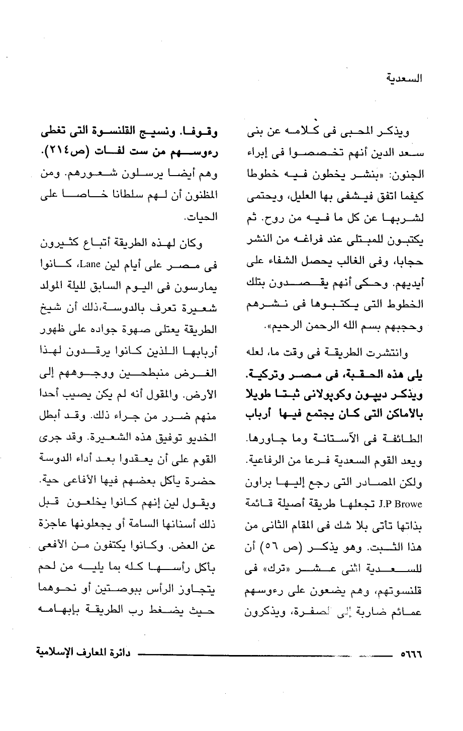 وانتشرت الطريقة فى وقت ما، لعله يلى هذه الحقبة، فى مصر وتركية. ويذكر ديبون وكوبولانى ثبتا طويلا بالأماكن التى كان يجتمع فيها أرباب الطائفة فى الآستانة وما جاورها. ويعد القوم السعدية فرعا من الرفاعية. ولكن المصادر التى رجع إليها براون J.P Browe تجعلها طريقة أصيلة قائمة بذاتها تأتى بلا شك فى المقام الثانى من هذا الثبت. وهو يذكر (ص 56) أن للسعدية اثنى عشر "ترك" فى قلنسوتهم، وهم يضعون على رءوسهم عمائم ضاربة إلى الصفرة، ويذكرون وقوفا. ونسيج القلنسوة التى تغطى رءوسهم من ست لفات (ص 214). وهم أيضًا يرسلون شعورهم. ومن المظنون أن لهم سلطانًا خاصا على الحيات.