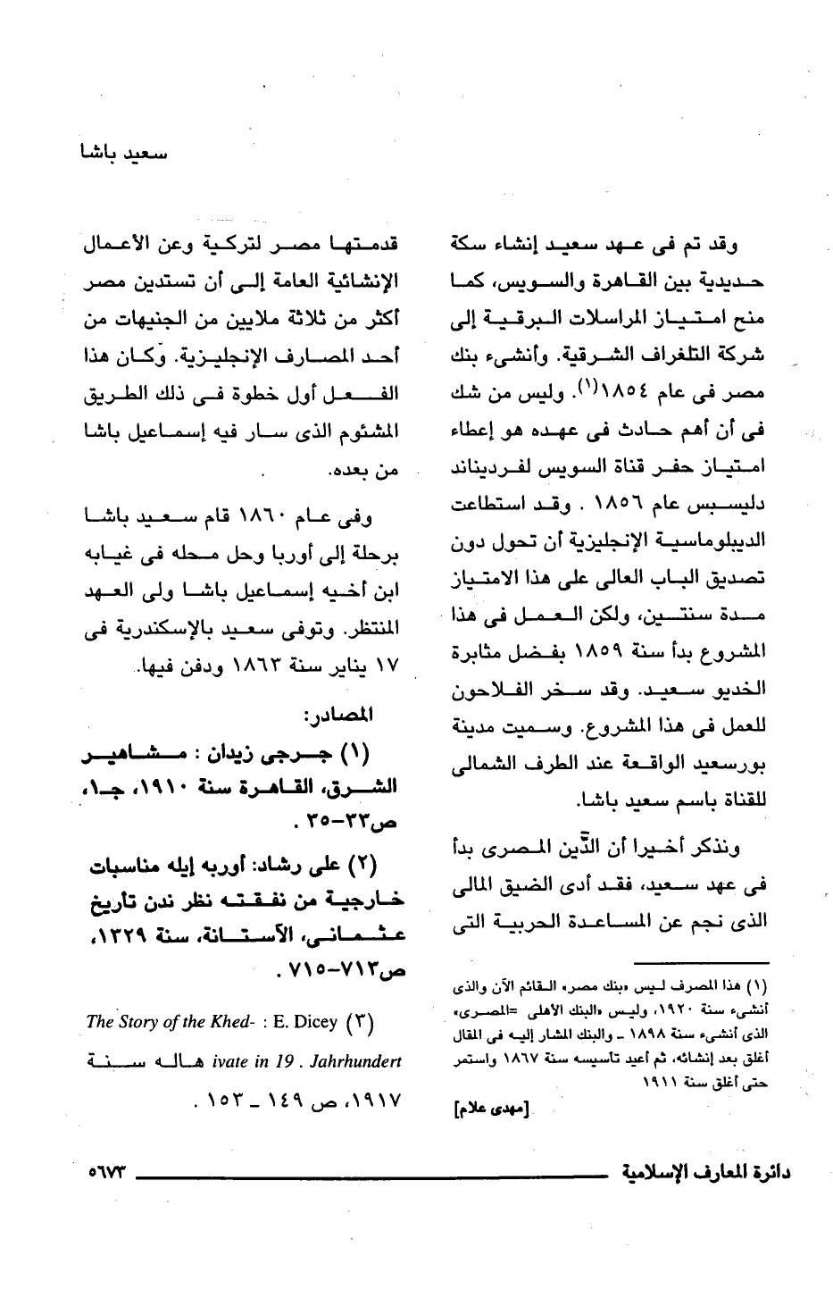 وقد تم فى عهد سعيد إنشاء سكة حديدية بين القاهرة والسويس، كما منح امتياز المراسلات البرقية إلى شركة التلغراف الشرقية. وأنشئ بنك مصر فى عام 1854 (¬1). وليس من شك فى أن أهم حادث فى عهده هو إعطاء امتياز حفر قناة السويس لفرديناند دليسبس عام 1856. وقد استطاعت الديبلوماسية الإنجليزية أن تحول دون تصديق الباب العالى على هذا الامتياز مدة سنتين، ولكن العمل فى هذا المشروع بدأ سنة 1859 بفضل مثابرة الخديو سعيد. وقد سخر الفلاحون للعمل فى هذا المشروع. وسميت مدينة بورسعيد الواقعة عند الطرف الشمالى للقناة باسم سعيد باشا.