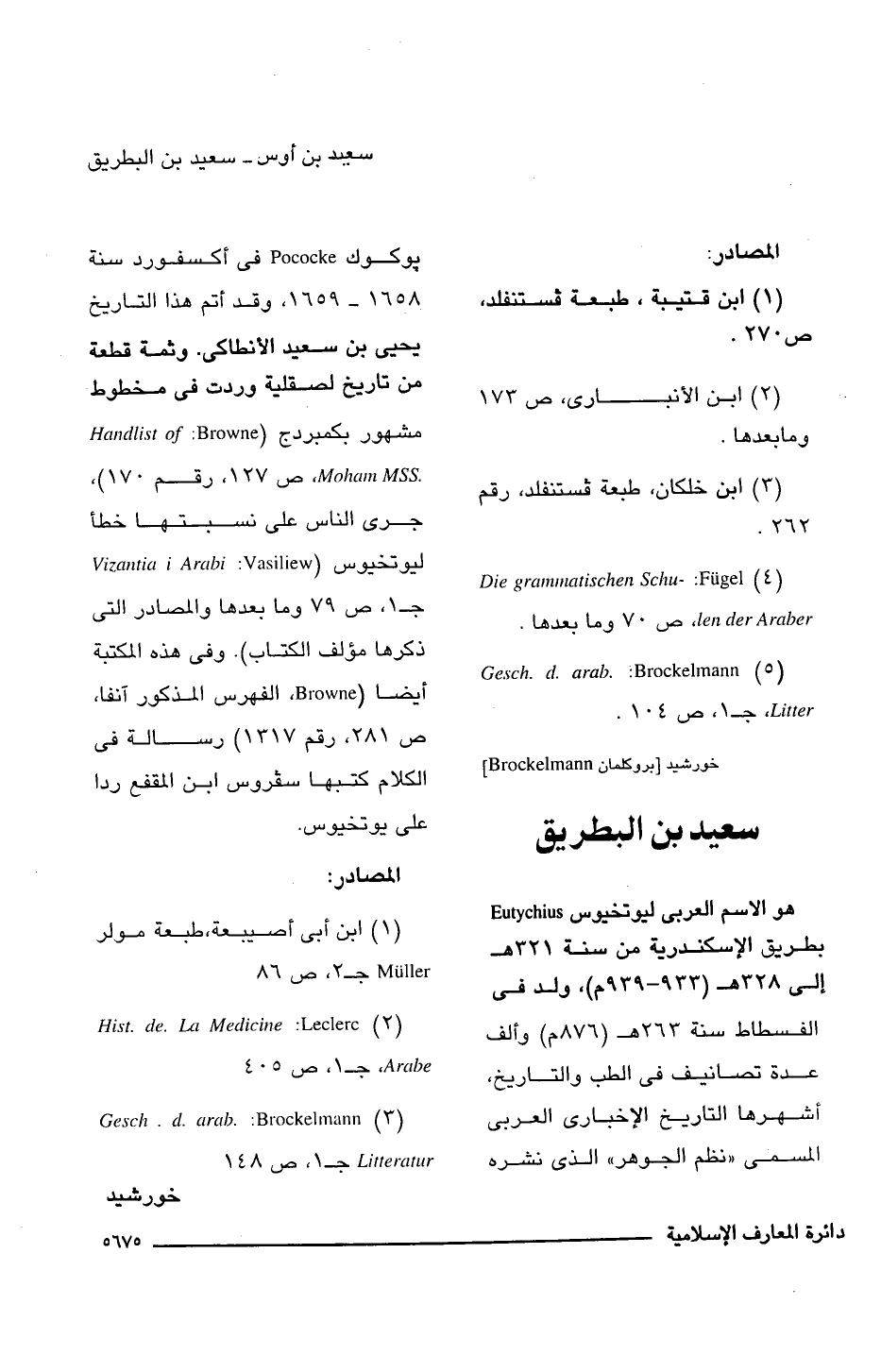 هو الاسم العربى ليوتخيوس Eutychius بطريق الإسكندرية من سنة 321 هـ إلى 328 هـ (939 - 933 م)، ولد فى الفسطاط سنة 263 هـ (876 م) وألف عدة تصانيف فى الطب والتاريخ، أشهرها التاريخ الإخبارى العربى المسمى "نظم الجوهر" الذى نشره بوكوك Pococke فى أكسفورد سنة 1658 - 1659، وقد أتم هذا التاريخ يحيى بن سعيد الأنطاكى. وثمة قطعة من تاريخ لصقلية وردت فى مخطوط مشهور بكمبردج (Handlist of Moham MSS: Browne، ص 127, رقم 170)، جرى الناس على نسبتها خطأ ليوتخيوس (Vizantia i Arabi: Vasiliew جـ 1، ص 79 وما بعدها والمصادر التى ذكرها مؤلف الكتاب). وفى هذه المكتبة أيضًا (Browne, الفهرس المذكور آنفا، ص 281, رقم 1317) رسالة فى الكلام كتبها سفروس ابن المقفع ردا على يوتخيوس.