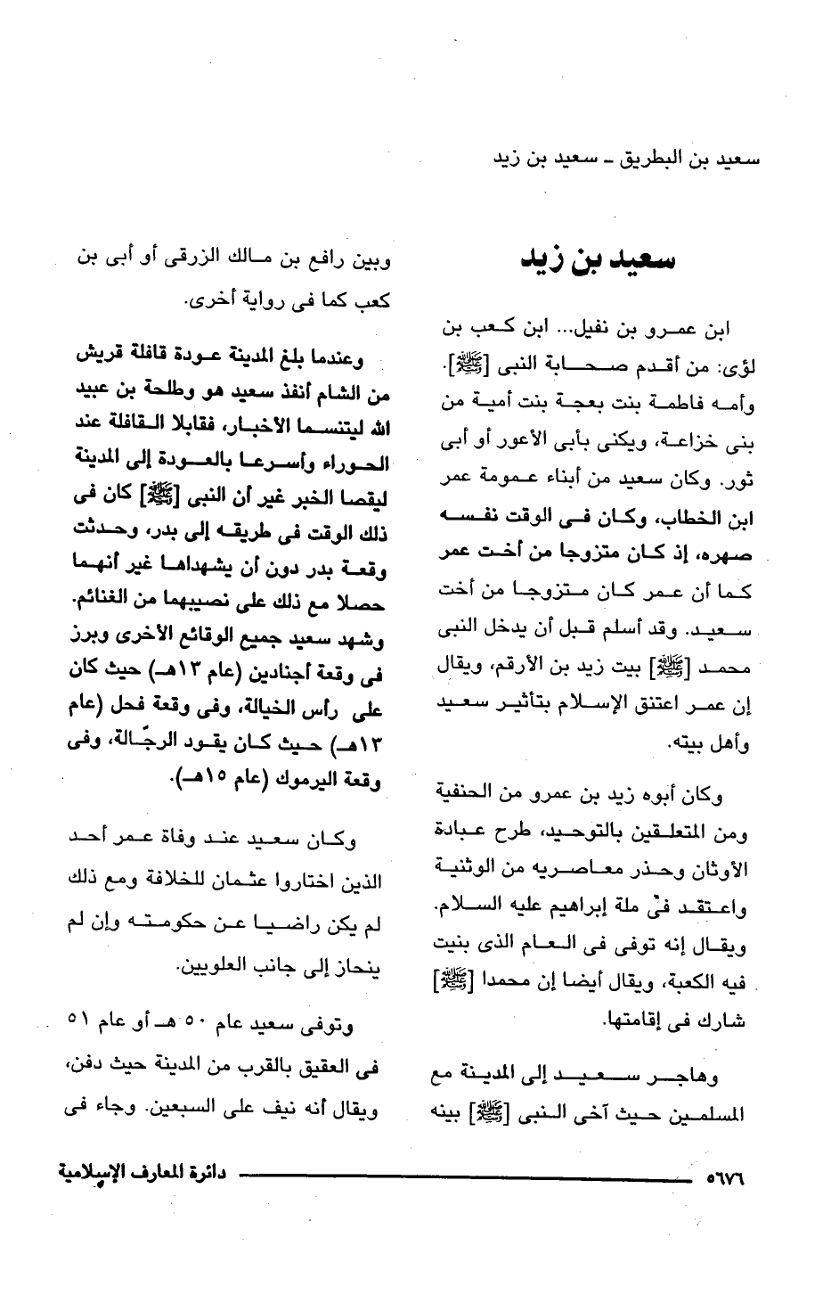 ابن عمرو بن نفيل. . . ابن كعب بن لؤى: من أقدم صحابة النبى [-صلى اللَّه عليه وسلم-]. وأمه فاطمة بنت بعجة بنت أمية من بنى خزاعة، ويكنى بأبى الأعور أو أبى ثور. وكان سعيد من أبناء عمومة عمر ابن الخطاب، وكان فى الوقت نفسه صهره، إذ كان متزوجا من أخت عمر كما أن عمر كان متزوجا من أخت سعيد. وقد أسلم قبل أن يدخل النبى محمد [-صلى اللَّه عليه وسلم-] بيت زيد بن الأرقم، ويقال إن عمر اعتنق الإسلام بتأثير سعيد وأهل بيته.
