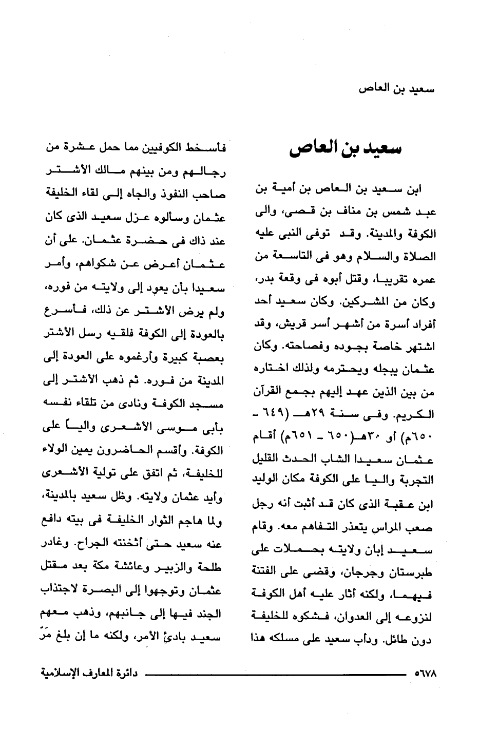 ابن سعيد بن العاص بن أمية بن عبد شمس بن مناف بن قصى، والى الكوفة والمدينة. وقد توفى النبى عليه الصلاة والسلام وهو فى التاسعة من عمره تقريبا، وقتل أبوه فى وقعة بدر، وكان من المشركين. وكان سعيد أحد أفراد أسرة من أشهر أسر قريش، وقد اشتهر خاصة بجوده وفصاحته. وكان عثمان يبجله ويحترمه ولذلك اختاره من بين الذين عهد إليهم بجمع القرآن الكريم. وفى سنة 29 هـ (649 - 650 م) أو 30 هـ (650 - 651 م) أقام عثمان سعيدا الشاب الحدث القليل التجربة واليا على الكوفة مكان الوليد ابن عقبة الذى كان قد أثبت أنه رجل صعب المراس يتعذر التفاهم معه. وقام سعيد إبان ولايته بحملات على طبرستان وجرجان، وقضى على الفتنة فيهما، ولكنه أثار عليه أهل الكوفة لنزوعه إلى العدوان، فشكوه للخليفة دون طائل. ودأب سعيد على مسلكه هذا فأسخط الكوفيين مما حمل عشرة من رجالهم ومن بينهم مالك الأشتر صاحب النفوذ والجاه إلى لقاء الخليفة عثمان وسألوه عزل سعيد الذى كان عند ذاك فى حضرة عثمان. على أن عثمان أعرض عن شكواهم، وأمر سعيدا بأن يعود إلى ولايته من فوره، ولم يرض الأشتر عن ذلك، فأسرع بالعودة إلى الكوفة فلقيه رسل الأشتر بعصبة كبيرة وأرغموه على العودة إلى المدينة من فوره. ثم ذهب الأشتر إلى مسجد الكوفة ونادى من للقاء نفسه بأبى موسى الأشعرى واليًا على الكوفة. وأقسم الحاضرون يمين الولاء للخليفة، ثم اتفق على تولية الأشعرى وأيد عثمان ولايته. وظل سعيد بالمدينة، ولما هاجم الثوار الخليفة فى بيته دافع عنه سعيد حتى أثخنته الجراح. وغادر طلحة والزبير وعائشة مكة بعد مقتل عثمان وتوجهوا إلى البصرة لاجتذاب الجند فيها إلى جانبهم، وذهب معهم سعيد بادئ الأمر، ولكنه ما إن بلغ مَرّ