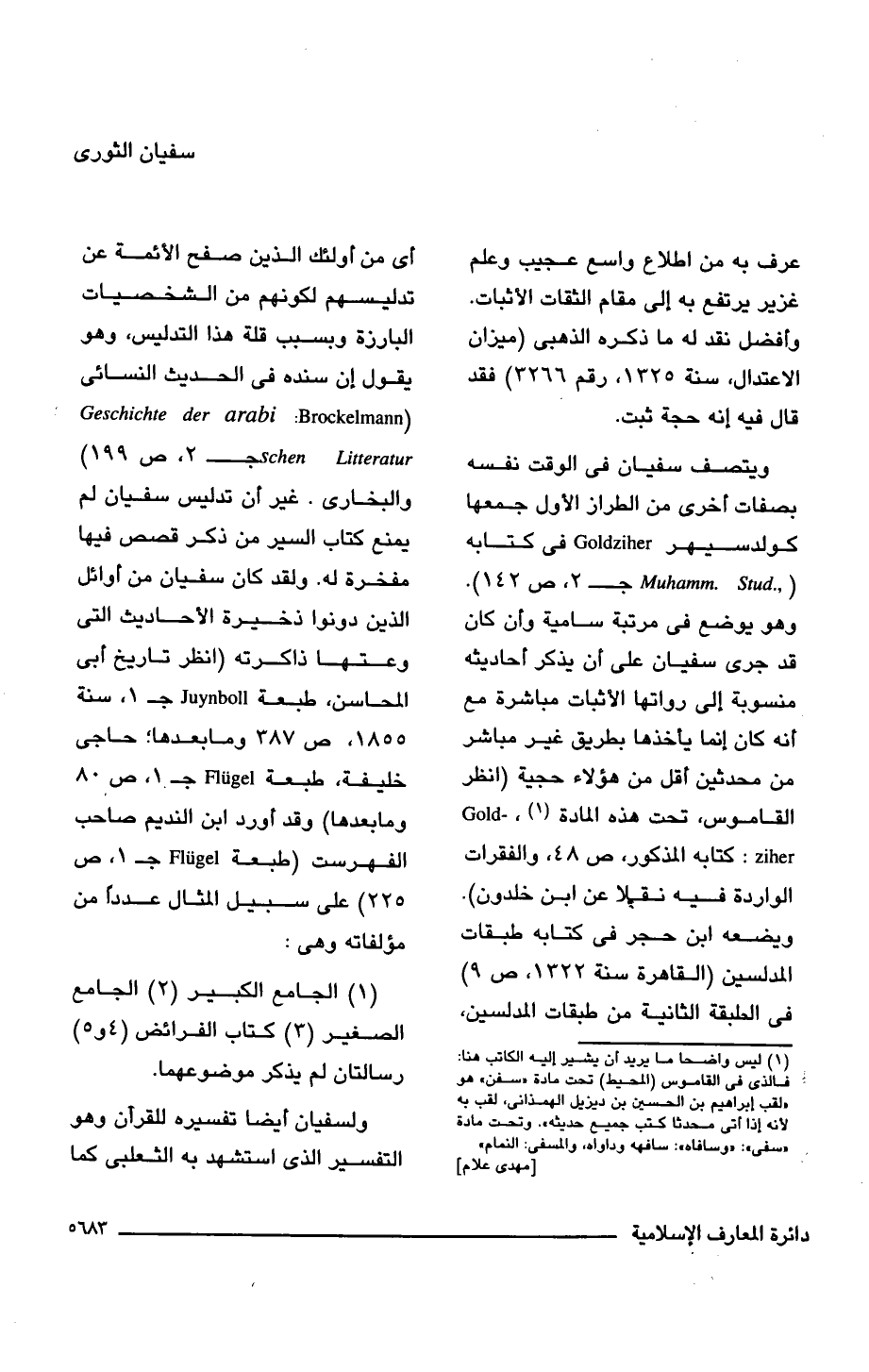 ويتصف سفيان فى الوقت نفسه بصفات أخرى من الطراز الأول جمعها كولدسيهر Goldziher فى كتابه (Muhamm. Stud، جـ 2، ص 142). وهو يوضع فى مرتبة سامية وأن كان قد جرى سفيان على أن يذكر أحاديثه منسوبة إلى رواتها الأثبات مباشرة مع أنه كان إنما يأخذها بطريق غير مباشر من محدثين أقل من هؤلاء حجية (انظر القاموس، تحت هذه المادة (¬1)، Goldziher: كتابه المذكور، ص 48، والفقرات الواردة فيه نقلًا عن ابن خلدون). ويضعه ابن حجر فى كتابه طبقات المدلسين (القاهرة سنة 1322، ص 9) فى الطبقة الثانية من طبقات المدلسين، أى من أولئك الذين صفح الأئمة عن تدليسهم لكونهم من الشخصيات البارزة وبسبب قلة هذا التدليس، وهو يقول إن سنده فى الحديث النسائى (Geschichte der arabi schen Litteratur: Brockelmann، جـ 2، ص 199) والبخارى. غير أن تدليس سفيان لم يمنع كتاب السير من ذكر قصص فيها مفخرة له. ولقد كان سفيان من أوائل الذين دونوا ذخيرة الأحاديث التى وعتها ذاكرته (انظر تاريخ أبى المحاسن، طبعة Juynboll جـ 1، سنة 1855، ص 387 وما بعدها؛ حاجى خليفة، طبعة Flugel جـ 1، ص 80 وما بعدها) وقد أورد ابن النديم صاحب الفهرست (طبعة Flugel جـ 1، ص 225) على سبيل المثال عددًا من مؤلفاته وهى: