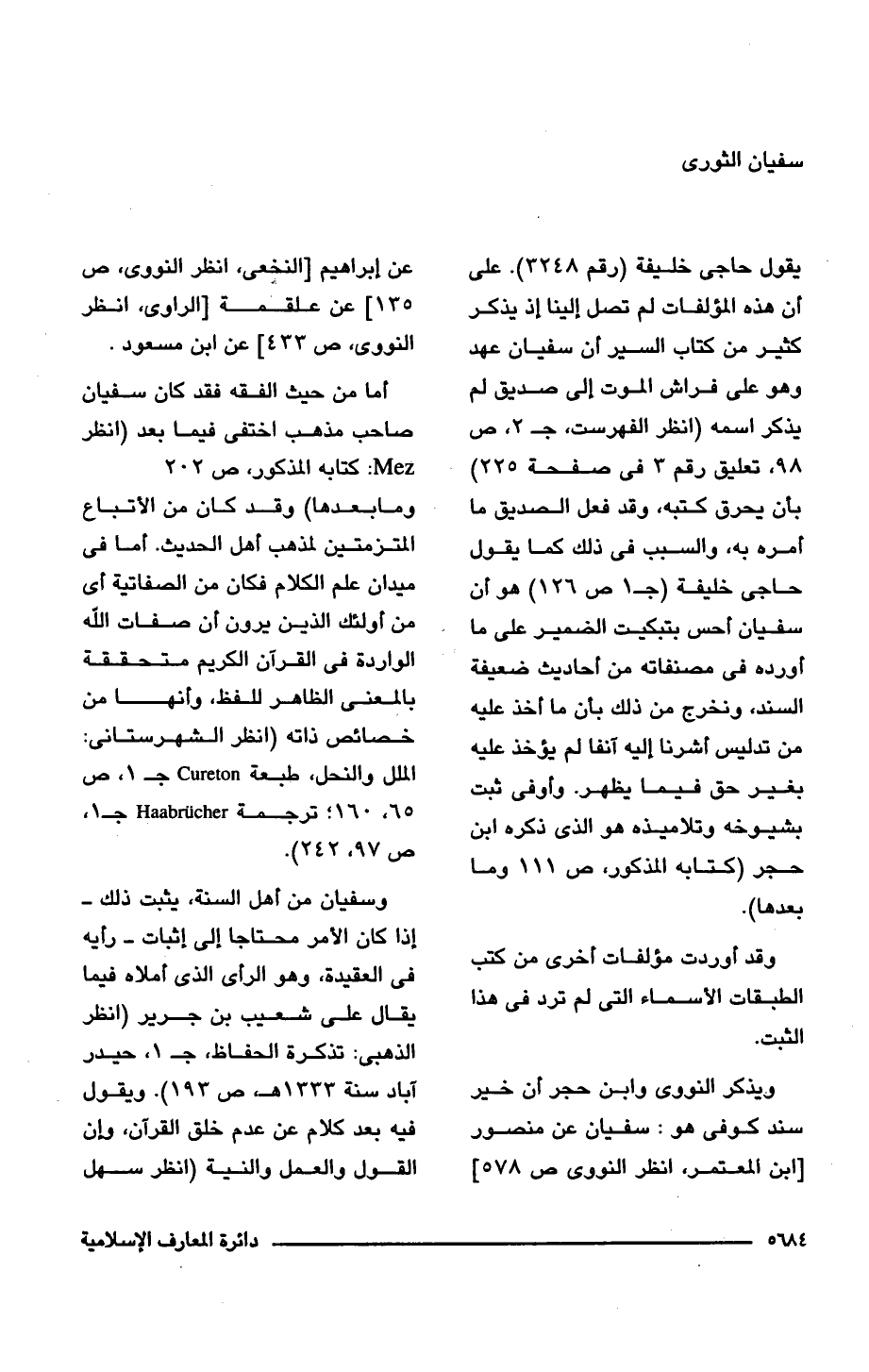 أما من حيث الفقه فقد كان سفيان صاحب مذهب اختفى فيما بعد (انظر Mez: كتابه المذكور، ص 202 وما بعدها) وقد كان من الأتباع المتزمتين لمذهب أهل الحديث. أما فى ميدان علم الكلام فكان من الصفاتية أى من أولئك الذين يرون أن صفات اللَّه الواردة فى القرآن الكريم متحققة بالمعنى الظاهر للفظ، وأنها من خصائص ذاته (انظر الشهرستانى: الملل والنحل، طبعة Cureton جـ 1، ص 65، 160؛ ترجمة Haabrucher جـ 1، ص 97، 242).