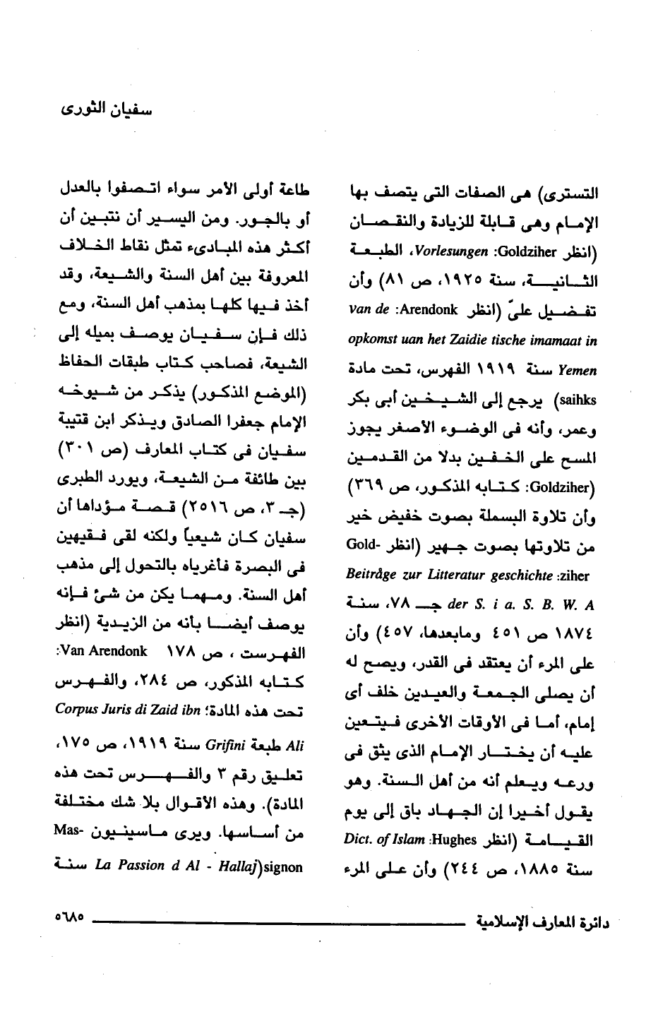 التسترى) هى الصفات التى يتصف بها الإمام وهى قابلة للزيادة والنقصان (انظر Vorlesungen: Goldziher، الطبعة الثانية، سنة 1925، ص 81) وأن تفضيل علىّ (انظر Arendonk: Van de opkonut uan het Zaidie tische imamaat in Yemen سنة 1919 الفهرس، تحت مادة saihks) يرجع إلى الشيخين أبى بكر وعمر، وأنه فى الوضوء الأصغر يجوز المسح على الخفين بدلا من القدمين (Goldziher: كتابه المذكور، ص 369) وأن تلاوة البسملة بصوت خفيض خير من تلاوتها بصوت جهير (انظر Gold Beitrdge zur Litteratur geschichte der S. i a. S. B. W. A: ziher جـ 78، سنة 1874 ص 451 وما بعدها، 457) وأن على المرء أن يعتقد فى القدر، ويصح له أن يصلى الجمعة والعيدين خلف أى إمام، أما فى الأوقات الأخرى فيتعين عليه أن يختار الإمام الذى يثق فى ورعه ويعلم أنه من أهل السنة. وهو يقول أخيرا إن الجهاد باق إلى يوم القيامة (انظر Dict. of Islam: Hughes سنة 1885، ص 244) وأن على المرء طاعة أولى الأمر سواء اتصفوا بالعدل أو بالجور. ومن اليسير أن نتبين أن أكثر هذه المبادئ تمثل نقاط الخلاف المعروفة بين أهل السنة والشيعة، وقد أخذ فيها كلها بمذهب أهل السنة، ومع ذلك فإن سفيان يوصف بميله إلى الشيعة، فصاحب كتاب طبقات الحفاظ (الموضع المذكور) يذكر من شيوخه الإمام جعفرا الصادق ويذكر ابن قتيبة سفيان فى كتاب المعارف (ص 301) بين طائفة من الشيعة، ويورد الطبرى (جـ 3، ص 2516) قصة مؤداها أن سفيان كان شيعيًا ولكنه لقى فقيهين فى البصرة فأغرياه بالتحول إلى مذهب أهل السنة. ومهما يكن من شئ فإنه يوصف أيضًا بأنه من الزيدية (انظر الفهرست، ص 178 Van Arendonk: كتابه المذكور، ص 284. والفهرس تحت هذه المادة؛ Corpus Juris di Zaid ibn Ali طبعة Grifini سنة 1919، ص 175 تعليق رقم 3 والفهرس تحت هذه المادة). وهذه الأقوال بلا شك مختلفة من أساسها. ويرى ماسينيون Massignon La Passion d Al-Hallaj) سنة