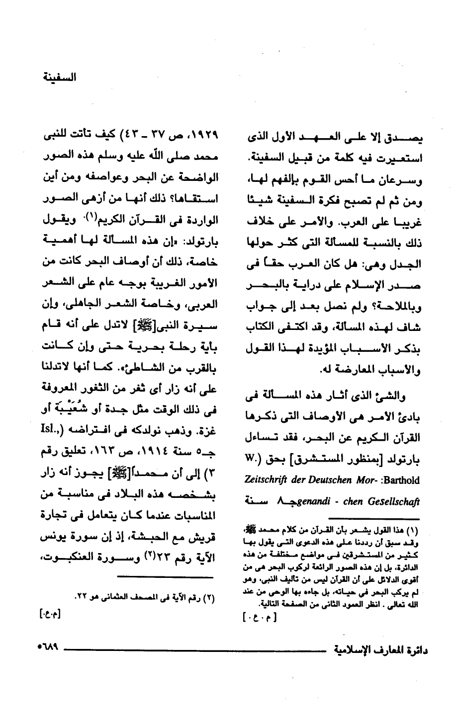 (¬1) هذا القول يشعر بأن القرآن من كلام محمد -صلى اللَّه عليه وسلم-، وقد سبق أن رددنا على هذه الدعوى التى يقول بها كثير من المستشرقين فى مواضع مختلفة من هذه الدائرة، بل أن هذه الصور الرانعة لركوب البحر هى من أقوى الدلائل على أن القرآن ليس من تأليف النبى، وهو لم يركب البحر فى حياته، بل جاءه بها الوحى من عند اللَّه تعالى. انظر العمود الثانى من الصفحة التالية. [م. ع]