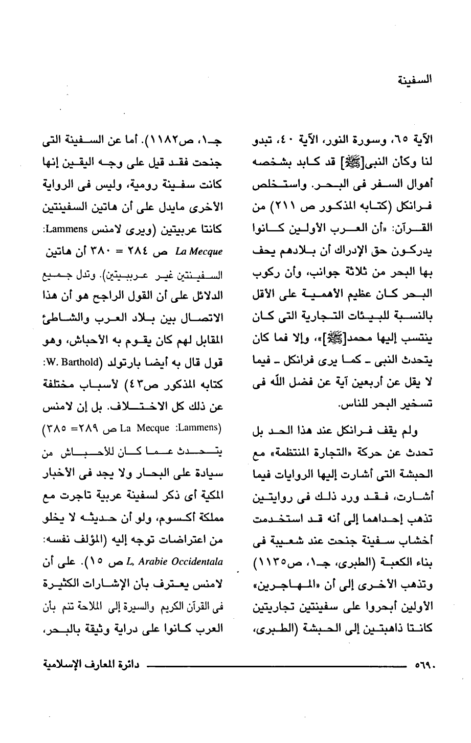 الآية 65، وسورة النور، الآية 40، تبدو لنا وكان النبى [-صلى اللَّه عليه وسلم-] قد كابد بشخصه أهوال السفر فى البحر. واستخلص فرانكل (كتابه المذكور ص 211) من القرآن: "أن العرب الأولين كانوا يدركون حق الإدراك أن بلادهم يحف بها البحر من ثلاثة جوانب، وأن ركوب البحر كان عظيم الأهمية على الأقل بالنسبة للبيئات التجارية التى كان ينتسب إليها محمد [-صلى اللَّه عليه وسلم-]، وإلا فما كان يتحدث النبى -كما يرى فرانكل- فيما لا يقل عن أربعين آية عن فضل اللَّه فى تسخير البحر للناس.