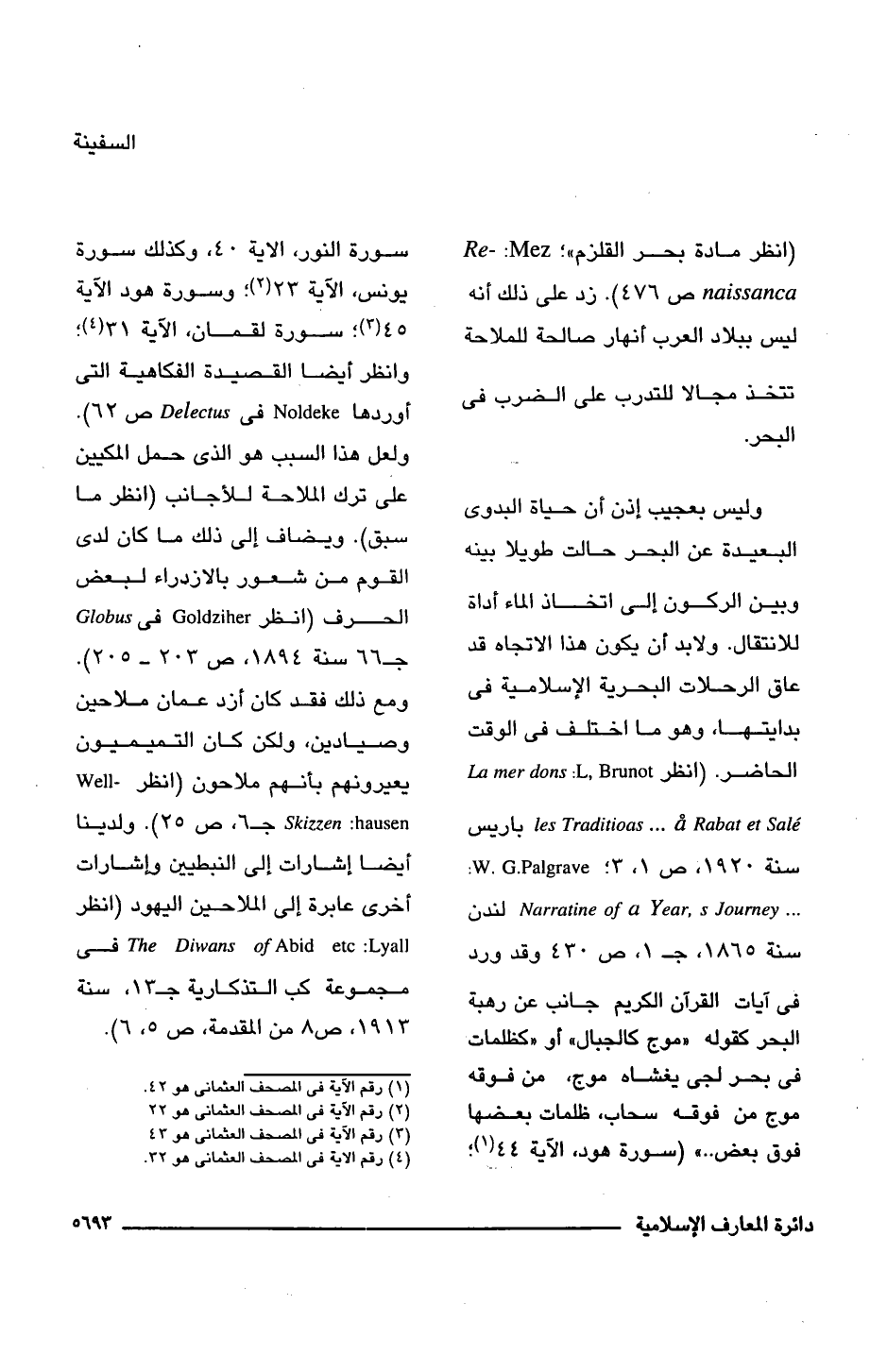 وليس بعجيب إذن أن حياة البدوى البعيدة عن البحر حالت طويلا بينه وبين الركون إلى اتخاذ الماء أداة للانتقال. ولابد أن يكون هذا الاتجاه قد عاق الرحلات البحرية الإسلامية فى بدايتها، وهو ما اختلف فى الوقت الحاضر. (انظر La mer donsles Traditioas. . .a Rabat et Sale: L, Brunot، باريس سنة 1920، ص 1، 3؛ Narratine of a Year,s Journey: W. G. Palgrave . . . لندن سنة 1865، جـ 1، ص 430 وقد ورد فى آيات القرآن الكريم جانب عن رهبة البحر كقوله "موج كالجبال" أو "كظلمات فى بحر لجى يغشاه موج، من فوقه موج من فوقه سحاب، ظلمات بعضها فوق بعض. ." (سورة هود، الآية 44 (¬1)؛ سورة النور، الآية 40، وكذلك سورة يونس، الآية (23) (¬2)؛ وسورة هود الآية 45 (¬3)؛ سورة لقمان، الآية 31 (¬4)؛ وانظر أيضا القصيدة الفكاهية التى أوردها Noldeke فى Delectus ص 62). ولعل هذا السبب هو الذى حمل المكيين على ترك الملاحة للأجانب (انظر ما سبق). ويضاف إلى ذلك ما كان لدى القوم من شعور بالازدراء لبعض الحرف (انظر Goldziher فى Globus جـ 66 سنة 1894، ص 203 - 205). ومع ذلك فقد كان أزد عمان ملاحين وصيادين، ولكن كان التميميون يعيرونهم بأنهم ملاحون (انظر Skizzen: Wellhausen جـ 6، ص 25). ولدينا أيضا إشارات إلى النبطيين وإشارات أخرى عابرة إلى الملاحين اليهود (انظر The Diwans of Abid etc: Lyall فى مجموعة كب التذكارية جـ 13، سنة 1913، ص 8 من المقدمة، ص 5، 6).