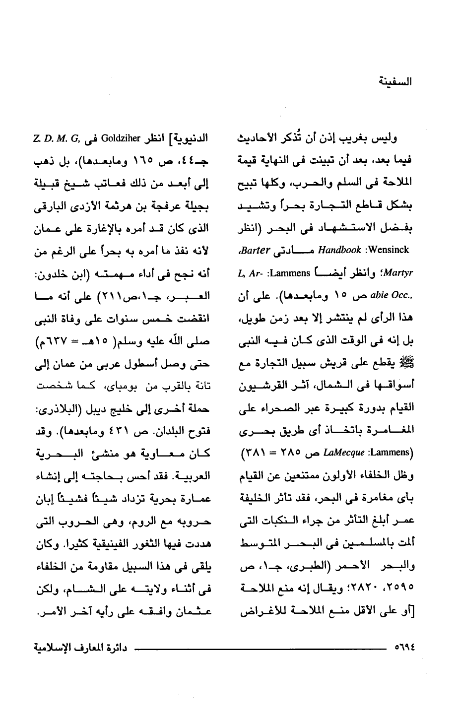 وليس بغريب اذن أن تُذكر الأحاديث فيما بعد، بعد أن تبينت فى النهاية قيمة الملاحة فى السلم والحرب، وكلها تبيح بشكل قاطع التجارة بحرًا وتشيد بفضل الاستشهاد فى البحر (انظر Handbook: Wensinck مادتى Barter, Martyr؛ وانظر أيضًا L, Arabie Occ.: Lammens, ص 15 وما بعدها). على أن هذا الرأى لم ينتشر إلا بعد زمن طويل، بل إنه فى الوقت الذى كان فيه النبى -صلى اللَّه عليه وسلم- يقطع على قريش سبيل التجارة مع أسواقها فى الشمال، آثر القرشيون القيام بدورة كبيرة عبر الصحراء على المغامرة باتخاذ أى طريق بحرى (LaMecque: Lammens ص 285 = 381) وظل الخلفاء الأولون ممتنعين عن القيام بأى مغامرة فى البحر، فقد تأثر الخليفة عمر أبلغ التأثر من جراء النكبات التى ألمت بالمسلمين فى البحر المتوسط والبحر الأحمر (الطبرى، جـ 1، ص 2595، 2820؛ ويقال إنه منع الملاحة [أو على الأقل منع الملاحة للأغراض الدنيوية] انظر Goldziher فى Z.D.M.G, جـ 44، ص 165 وما بعدها)، بل ذهب إلى أبعد من ذلك فعاتب شيخ قبيلة بجيلة عرفجة بن هرثمة الأزدى البارقى الذى كان قد أمره بالإغارة على عمان لأنه نفذ ما أمره به بحرًا على الرغم من أنه نجح فى أداء مهمته (ابن خلدون: العبر، جـ 1، ص 211) على أنه ما انقضت خمس سنوات على وفاة النبى صلى اللَّه عليه وسلم (15 هـ = 637 م) حتى وصل أسطول عربى من عمان إلى تانة بالقرب من بومباى، كما شخصت حملة أخرى إلى خليج ديبل (البلاذرى: فتوح البلدان. ص 431 وما بعدها). وقد كان معاوية هو منشئ البحرية العربية. فقد أحس بحاجته إلى إنشاء عمارة بحرية تزداد شيئًا فشيئًا إبان حروبه مع الروم، وهى الحروب التى هددت فيها الثغور الفينيقية كثيرا. وكان يلقى فى هذا السبيل مقاومة من الخلفاء فى أثناء ولايته على الشام، ولكن عثمان وافقه على رأيه آخر الأمر.