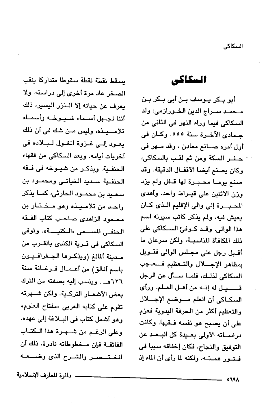 أبو بكر يوسف بن أبى بكر بن محمد سراج الدين الخورازمى: ولد السكاكى فيما وراء النهر فى الثانى من جمادى الآخرة سنة 555. وكان فى أول أمره صانع معادن، وقد مهر فى حفر السكة ومن ثم لقب بالسكاكى، وكان يصنع أيضا الأقفال الدقيقة. وقد صنع يوما محبرة لها قفل ولم يزد وزن الاثنين على قيراط واحد. وأهدى المحبرة إلى والى الإقليم الذى كان يعيش فيه، ولم يذكر كاتب سيرته اسم هذا الوالى. وقد كوفئ السكاكى على ذلك المكافاة المناسبة، ولكن سرعان ما أقبل رجل على مجلس الوالى فقوبل بمظاهر الإجلال والتعظيم فعجب السكاكى لذلك، فلما سأل عن الرجل قيل له إنه من أهل العلم. ورأى السكاكى أن العلم موضع الإجلال والتعظيم أكثر من الحرفة اليدوية فعزم على أن يصبح هو نفسه فقيها. وكانت دراساته الأولى بعيدة كل البعد عن التوفيق والنجاح، فكان إخفاقه سببا فى فتور همته، ولكنه لما رأى أن الماء إذ يسقط نقطة نقطة سقوطا متداركا ينقب الصخر عاد مرة أخرى إلى دراسته. ولا يعرف عن حياته إلا النزر اليسير، ذلك أننا نجهل أسماء شيوخه وأسماء تلاميذه، وليس من شك فى أن ذلك يعود إلى غزوة المغول لبلاده فى أخريات أيامه. ويعد السكاكى من فقهاء الحنفية. ويذكر من شيوخه فى فقه الحنفية سديد الخياتى ومحمود بن سعيد بن محمود الحارثى، كما يذكر واحد من تلاميذه وهو مختار بن محمود الزاهدى صاحب كتاب الفقه الحنفى المسمى "الكنية". وتوفى السكاكى فى قرية الكندى بالقرب من مدينة ألمالغ (ويذكرها الجغرافيون باسم ألمالق) من أعمال فرغانة سنة 626 هـ. وينسب إليه بصفته من الترك بعض الأشعار التركية، ولكن شهرته تقوم على كتابه العربى "مفتاح العلوم" وهو أشمل كتاب فى البلاغة إلى عهده. وعلى الرغم من شهرة هذا الكتاب الفائقة فإن مخطوطاته نادرة، ذلك أن المختصر والشرح الذى وضعه