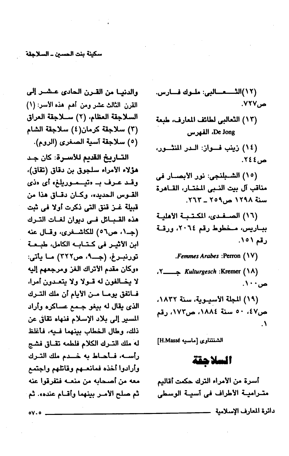 أسرة من الأمراء الترك حكمت أقاليم مترامية الأطراف فى آسية الوسطى والدنيا من القرن الحادى عشر إلى القرن الثالث عشر ومن أهم هذه الأسر: (1) السلاجقة العظام، (2) سلاجقة العراق (3) سلاجقة كرمان (4) سلاجقة الشام (5) سلاجقة آسية الصغرى (الروم).
