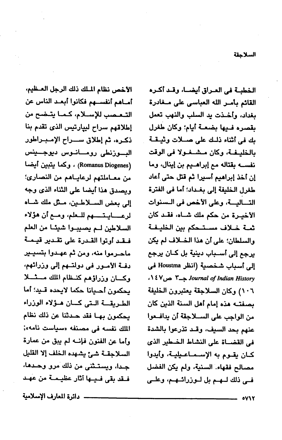 الخطبة فى العراق أيضًا، وقد أكره القائم بأمر اللَّه العباسى على مغادرة بغداد، وأخذت يد السلب والنهب تعمل بقصره فيها بضعة أيام؛ وكان طغرل بك فى أثناء ذلك على صلات وثيقة بالخليفة، وكان مشغولا فى الوقت نفسه بقتاله مع إبراهيم بن إينال، وما إن أخذ إبراهيم أسيرا ثم قتل حتى أعاد طغرل الخليفة إلى بغداد؛ أما فى الفترة التالية، وعلى الأخص فى السنوات الأخيرة من حكم ملك شاه، فقد كان ثمة خلاف مستحكم بين الخليفة والسلطان؛ على أن هذا الخلاف لم يكن يرجع إلى أسباب دينية بل كان يرجع إلى أسباب شخصية (انظر Houstma فى Journal of indian History جـ 3، ص 147، 106) وكان السلاجقة يعتبرون الخليفة بصفته هذه إمام أهل السنة الذين كان من الواجب على السلاجقة أن يدافعوا عنهم بحد السيف، وقد تذرعوا بالشدة فى القضاة على النشاط الخطير الذى كان يقوم به الإسماعيلية، وأيدوا مصالح فقهاء السنية، ولم يكن الفضل فى ذلك لهم بل لوزرائهم، وعلى الأخص نظام الملك ذلك الرجل العظيم، أما هم أنفسهم فكانوا أبعد الناس عن التعصب للإسلام، كما يتضح من إطلاقهم سراح ليبارتيس الذى تقدم بنا ذكره، ثم إطلاق سراح الإمبراطور البوزنطى رومانوس ديوجينس (Romanus Diogenes)، وكما يتبين أيضًا من معاملتهم لرعاياهم من النصارى؛ ويصدق هذا أيضًا على الثناء الذى وجه إلى بعض السلاطين، مثل ملك شاه لرعايتهم للعلم، ومع أن هؤلاء السلاطين لم يصيبوا شيئا من العلم فقد أوتوا القدرة على تقدير قيمة ما حرموا منه، ومن ثم عهدوا بتسيير دفة الأمور فى دولتهم إلى وزرائهم، وكان وزراؤهم كنظام الملك مثلا يحكمون أحيانا حكما لا يحده قيد؛ أما الطريقة التى كان هؤلاء الوزراء يحكمون بها فقد حدثنا عن ذلك نظام الملك نفسه فى مصنفه "سياست نامه"؛ وأما عن الفنون فإنه لم يبق من عمارة السلاجقة شئ يشهده الخلف إلا القليل جدا، ويستثنى من ذلك مرو وحدها، فقد بقى فيها آثار عظيمة من عهد