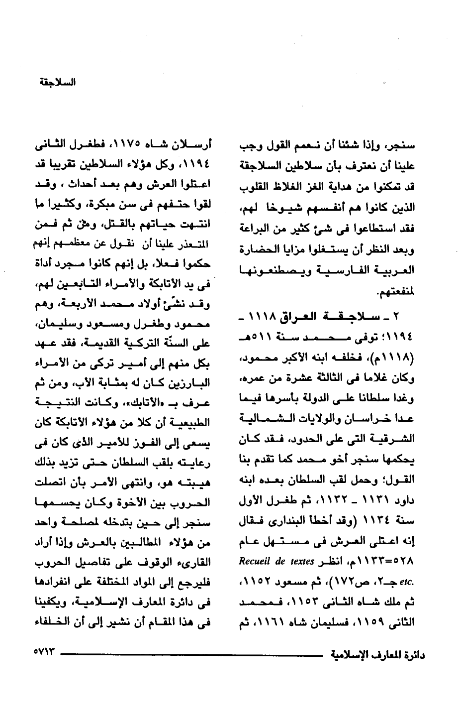 2 - سلاجقة العراق 1148 - 1194؛ توفى محمد سنة 511 هـ (1118 م)، فخلفه ابنه الأكبر محمود، وكان غلاما فى الثالثة عشرة من عمره، وغدا سلطانًا على الدولة بأسرها فيما عدا خراسان والولايات الشمالية الشرقية التى على الحدود، فقد كان يحكمها سنجر أخو محمد كما تقدم بنا القول؛ وحمل لقب السلطان بعده ابنه داود 1131 - 1132، ثم طغرل الأول سنة 1134 (وقد أخطأ البندارى فقال إنه اعتلى العرش فى مستهل عام 528 = 1133 م، انظر Recueil de textes etc جـ 2 ص 172)، ثم مسعود 1152، ثم ملك شاه الثانى 1153، فمحمد الثانى 1159، فسليمان شاه 1161، ثم أرسلان شاه 1175. فطغرل الثانى 1194، وكل هؤلاء السلاطين تقريبا قد اعتلوا العرش وهم بعد أحداث، وقد لقوا حتفهم فى سن مبكرة، وكثيرا ما انتهت حياتهم بالقتل، ومن ثم فمن المتعذر علينا أن نقول عن معظمهم إنهم حكموا فعلا، بل إنهم كانوا مجرد أداة فى يد الأتابكة والأمراء التابعين لهم، وقد نشّئ أولاد محمد الأربعة، وهم محمود وطغرل ومسعود وسليمان، على السنّة التركية القديمة، فقد عهد بكل منهم إلى أمير تركى من الأمراء البارزين كان له بمثابة الأب، ومن ثم عرف بـ "الأتابك"، وكانت النتيجة الطبيعية أن كلا من هؤلاء الأتابكة كان يسعى إلى الفوز للأمير الذى كان فى رعايته بلقب السلطان حتى تزيد بذلك هيبته هو، وانتهى الأمر بأن اتصلت الحروب بين الأخوة وكان يحسمها سنجر إلى حين بتدخله لمصلحة واحد من هؤلاء المطالبين بالعرش وإذا أراد القارئ الوقوف على تفاصيل الحروب فليرجع إلى المواد المختلفة على انفرادها فى دائرة المعارف الإسلامية، ويكفينا فى هذا المقام أن نشير إلى أن الخلفاء