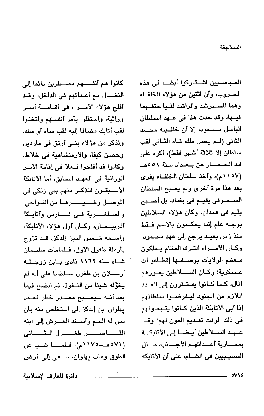 العباسيين اشتركوا أيضا فى هذه الحروب، وأن اثنين من هؤلاء الخلفاء وهما المسترشد والراشد لقيا حتفهما فيها، وقد حدث هذا فى عهد السلطان الباسل مسعود، إلا أن خلفيته محمد الثانى (لم يحمل ملك شاه الثانى لقب سلطان إلا ثلاثة أشهر فقط)، أكره على فك الحصار عن بغداد سنة 551 هـ (1157 م)، وأخذ سلطان الخلفاء يقوى بعد هذا مرة أخرى ولم يصبح السلطان السلجوقى يقيم فى بغداد، بل أصبح يقيم فى همذان، وكان هؤلاء السلاطين بوجه عام إنما يحكمون بالاسم فقط منذ زمن بعيد يرجع إلى عهد محمود، وكان الأمراء الترك العظام يملكون معظم الولايات بوصفها إقطاعيات عسكرية؛ وكان السلاطين يعوزهم المال، كما كانوا يفتقرون إلى العدد اللازم من الجنود ليفرضوا سلطانهم إذا أبى الأتابكة الذين كانوا يتبعونهم فى ذلك الوقت تقديم العون لهم؛ وقد عهد السلاطين أيضا إلى الأتابكة بمحاربة أعدائهم الأجانب، مثل الصليبيين فى الشام، على أن الأتابكة كانوا هم أنفسهم مضطرين دائما إلى النضال مع أعدائهم فى الداخل، وقد أفلح هؤلاء الأمراء فى إقامة أسر وراثية، واستقلوا بأمر أنفسهم واتخذوا لقب أتابك مضافا إليه لقب شاه أو ملك، ونذكر من هؤلاء بنى أرتق فى ماردين وحصن كيفا، والأرمنشاهية فى خلاط، وكانوا قد أفلحوا فعلا فى إقامة الأسر الوراثية فى العهد السابق، أما الأتابكة الأسبقون فنذكر منهم بنى زنكى فى الموصل وغيرها من النواحى، والسلغرية فى فارس وأتابكة أذربيجان، وكان أول هؤلاء الأتابكة، واسمه شمس الدين إلدكز، قد تزوج بأرملة طغرل الأول، فلما مات سليمان شاه سنة 1162 نادى بابن زوجته أرسلان بن طغرل سلطانًا على أنه لم يخوّله شيئا من النفوذ، ثم اتضح فيما بعد أنه سيصبح مصدر خطر فعمد بهلوان بن إلدكز إلى التخلص منه بأن دس له السم وأسند العرش إلى ابنه القاصر طغرل الثانى (571 هـ = 1175 م)، فلما شب عن الطوق ومات بهلوان، سعى إلى فرض