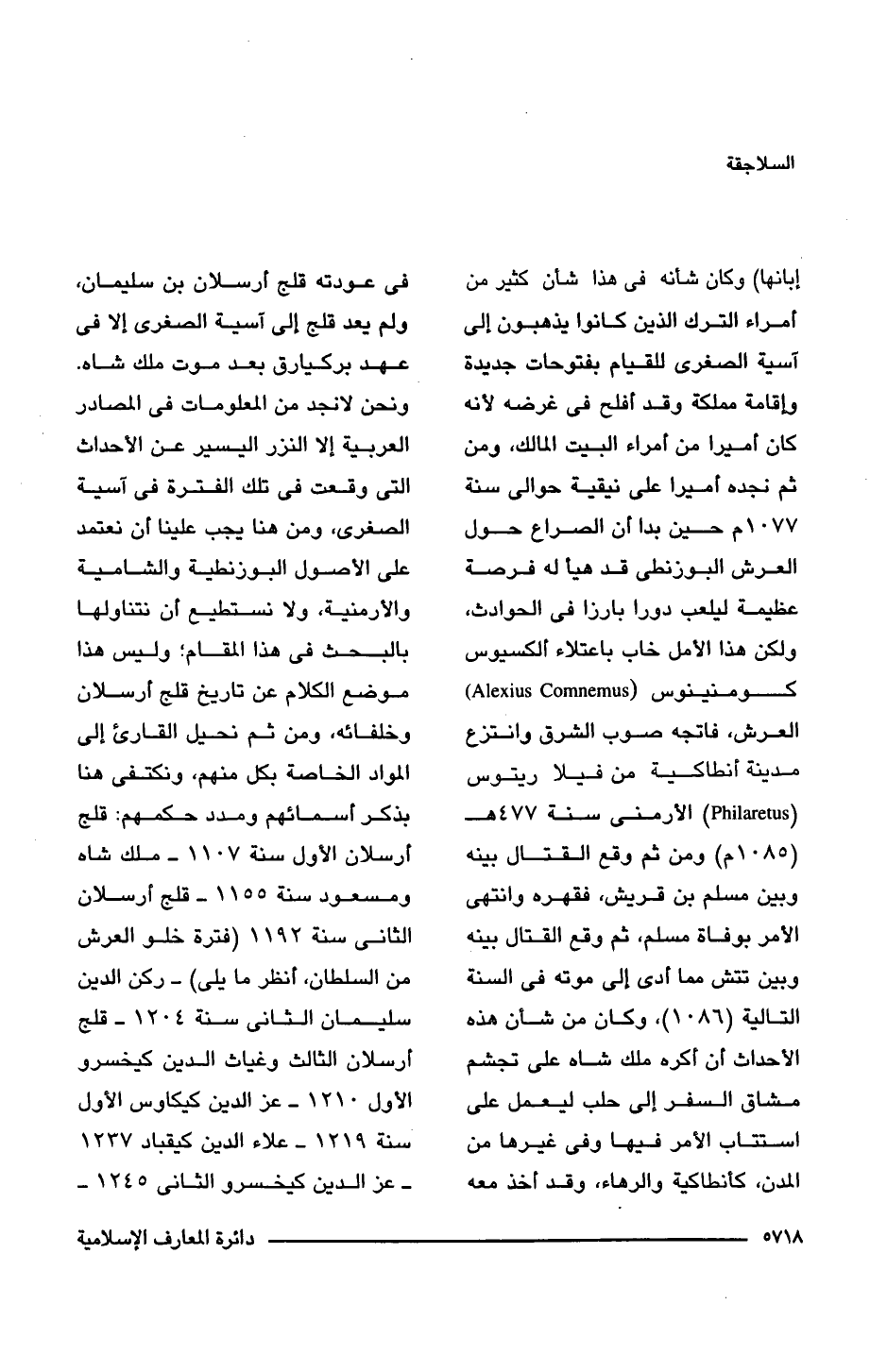 إبانها) وكان شأنه فى هذا شأن كثير من أمراء الترك الذين كانوا يذهبون إلى آسية الصغرى للقيام بفتوحات جديدة وإقامة مملكة وقد أفلح فى غرضه لأنه كان أميرا من أمراء البيت المالك، ومن ثم نجده أميرا على نيقية حوالى سنة 1077 م حين بدا أن الصراع حول العرش البوزنطى قد هيأ له فرصة عظيمة ليلعب دورا بارزا فى الحوادث، ولكن هذا الأمل خاب باعتلاء ألكسيوس كومنينوس (Alexius Comnemus) العرش، فاتجه صوب الشرق وانتزع مدينة أنطاكية من فيلا ريتوس (Philaretus) الأرمنى سنة 477 هـ (1085 م) ومن ثم وقع القتال بينه وبين مسلم بن قريش، فقهره وانتهى الأمر بوفاة مسلم، ثم وقع القتال بينه وبين تتش مما أدى إلى موته فى السنة التالية (1086)، وكان من شأن هذه الأحداث أن أكره ملك شاه على تجشم مشاق السفر إلى حلب ليعمل على استتاب الأمر فيها وفى غيرها من المدن، كأنطاكية والرهاء، وقد أخذ معه فى عودته قلج أرسلان بن سليمان، ولم يعد قلج إلى آسية الصغرى إلا فى عهد بركيارق بعد موت ملك شاه. ونحن لا نجد من المعلومات فى المصادر العربية إلا النزر اليسير عن الأحداث التى وقعت فى تلك الفترة فى آسية الصغرى، ومن هنا يجب علينا أن نعتمد على الأصول البوزنطية والشامية والأرمنية، ولا نستطيع أن نتناولها بالبحث فى هذا المقام؛ وليس هذا موضع الكلام عن تاريخ قلج أرسلان وخلفائه، ومن ثم نحيل القارئ إلى المواد الخاصة بكل منهم، ونكتفى هنا بذكر أسمائهم ومدد حكمهم: قلج أرسلان الأول سنة 1107 - ملك شاه ومسعود سنة 1155 - قلج أرسلان الثانى سنة 1192 (فترة خلو العرش من السلطان، انظر ما يلى) - ركن الدين سليمان الثانى سنة 1204 - قلج أرسلان الثالث وغياث الدين كيخسرو الأول 1210 - عز الدين كيكاوس الأول سنة 1219 - علاء الدين كيقباد 1237 - عز الدين كيخسرو الثانى 1245 -