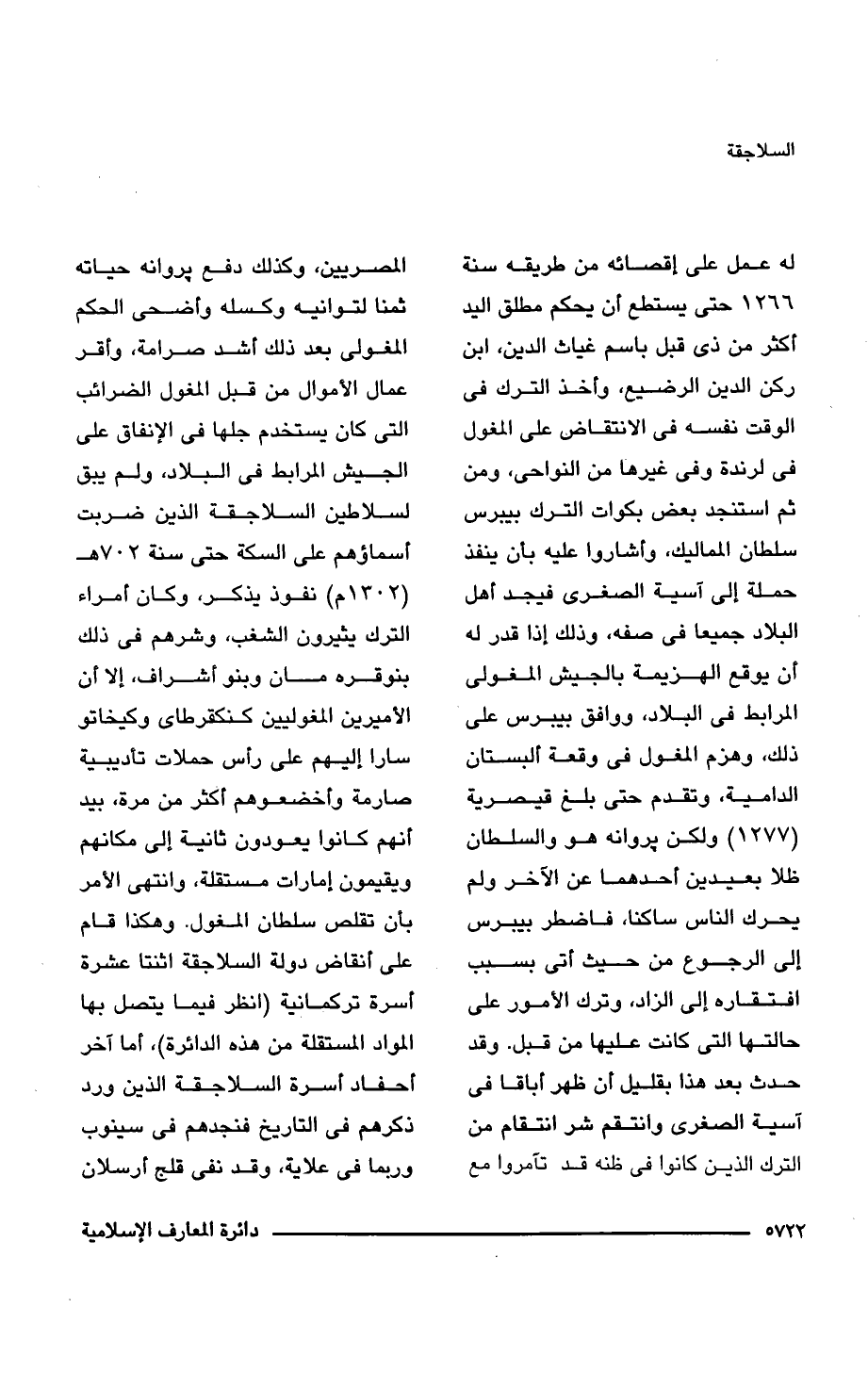 له عمل على إقصائه من طريقه سنة 1266 حتى يستطع أن يحكم مطلق اليد أكثر من ذى قبل باسم غياث الدين، ابن ركن الدين الرضيع، وأخذ الترك فى الوقت نفسه فى الانتقاض على المغول فى لرندة وفى غيرها من النواحى، ومن ثم استنجد بعض بكوات الترك بيبرس سلطان المماليك، وأشاروا عليه بأن ينفذ حملة إلى آسية الصغرى فيجد أهل البلاد جميعا فى صفه، وذلك إذا قدر له أن يوقع الهزيمة بالجيش المغولى المرابط فى البلاد، ووافق بيبرس على ذلك، وهزم المغول فى وقعة ألبستان الدامية، وتقدم حتى بلغ قيصرية (1277) ولكن بروانه هو والسلطان ظلا بعيدين أحدهما عن الآخر ولم يحرك الناس ساكنا، فاضطر بيبرس إلى الرجوع من حيث أتى بسبب افتقاره إلى الزاد، وترك الأمور على حالتها التى كانت عليها من قبل. وقد حدث بعد هذا بقليل أن ظهر أباقا فى آسية الصغرى وانتقم شر انتقام من الترك الذين كانوا فى ظنه قد تآمروا مع المصريين، وكذلك دفع بروانه حياته ثمنا لتوانيه وكسله وأضحى الحكم المغولى بعد ذلك أشد صرامة، وأقر عمال الأموال من قبل المغول الضرائب التى كان يستخدم جلها فى الإنفاق على الجيش المرابط فى البلاد، ولم يبق لسلاطين السلاجقة الذين ضربت أسماؤهم على السكة حتى سنة 702 هـ (1302 م) نفوذ يذكر، وكان أمراء الترك يثيرون الشغب، وشرهم فى ذلك بنوقره مان وبنو أشراف، إلا أن الأميرين المغوليين كنكقرطاى وكيخاتو سارا إليهم على رأس حملات تأديبية صارمة وأخضعوهم أكثر من مرة، بيد أنهم كانوا يعودون ثانية إلى مكانهم ويقيمون إمارات مستقلة، وانتهى الأمر بأن تقلص سلطان المغول. وهكذا قام على أنقاض دولة السلاجقة اثنتا عشرة أسرة تركمانية (انظر فيما يتصل بها المواد المستقلة من هذه الدائرة)، أما آخر أحفاد أسرة السلاجقة الذين ورد ذكرهم فى التاريخ فنجدهم فى سينوب وربما فى علاية، وقد نفى قلج أرسلان