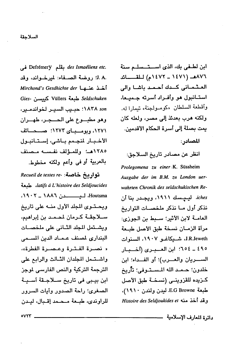 انظر عن مصادر تاريخ السلاجق: Prolegomena zu einer Ausgabe der im B.M. zu London uerwahrten Chronik des seldschukischen Reiches: K. Sussheim, ليبسك 1911، ويجدر بنا أن نذكر أول ما نذكر ملخصات التواريخ العامة لابن الأثير؛ سبط بن الجوزى: مرآة الزمان نسخة طبق الأصل طبعة J.R.Jeweth، شيكاغو 1907، السنوات 495 - 654؛ ابن العبرى (أخبار السريان والعرب)؛ أو الفداء؛ ابن خلدون؛ حمد اللَّه المستوفى؛ تأريخ كزيده للقزوينى (نسخة طبق الأصل طبعة E.G Browne، ليدن ولندن 1910)، وقد أخذ منه Histoire des Seldioukides et des lsmaeliens etc بقلم Defremery فى J. A؛ روضة الصفاء: لميرخواند، وقد أخذ عنها Mirchond's Gesdhichte der Seldschuken طبعة Vulleers كييسن Giesson 1838؛ حبيب السير لخواندمير، وهو مطبوع على الحجر، طهران 1271، وبومباى 1273؛ صحائف الأخبار لمنجمم باشى، إستانبول 1285؛ وللمؤلف نفسه مصنف بالعربية أوفى وأعم ولكنه مخطوط.